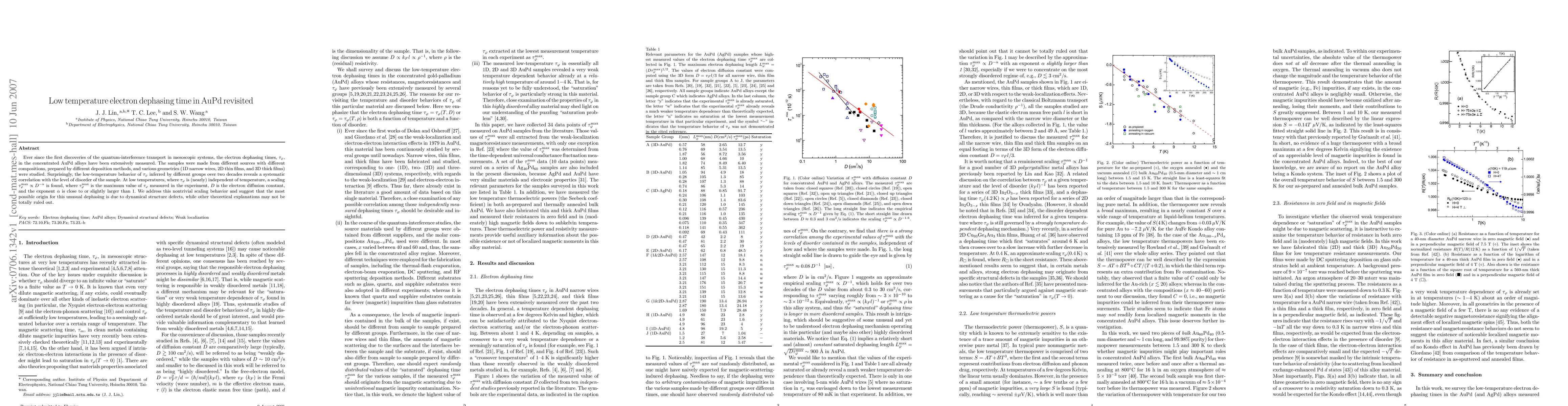 This paper revisits the low-temperature electron dephasing time in AuPd alloys, finding a systematic correlation between $\tau_\phi$ and sample disorder, with a scaling $\tau_\phi^{\rm max} \propto D^{-\alpha}$ suggesting the influence of dynamical structure defects. The study highlights the complex relationship between dephasing time and material disorder in mesoscopic systems.