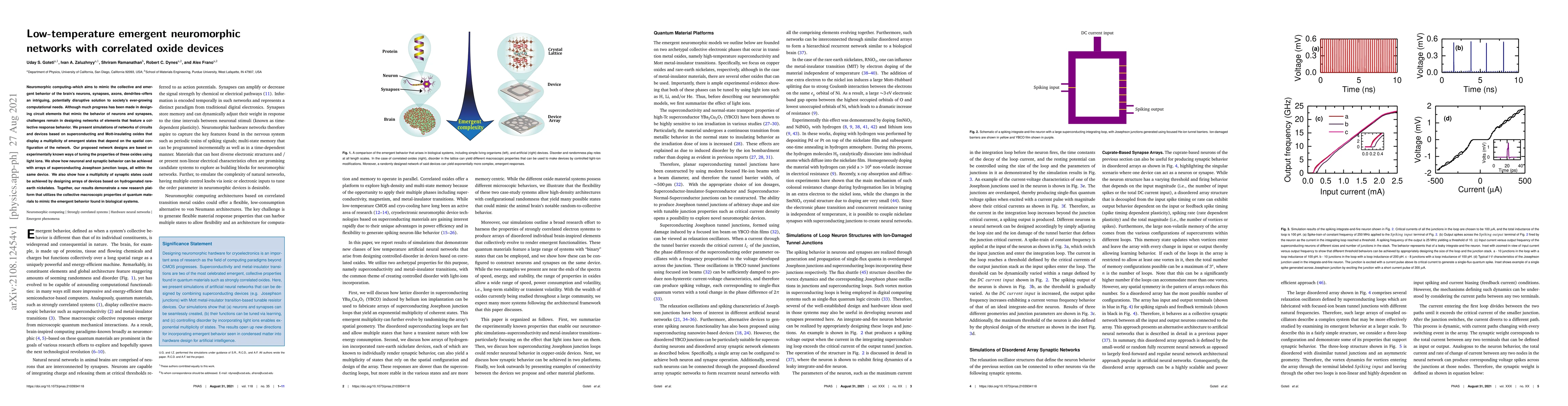 Neuromorphic computing which aims to mimic the collective and emergent behavior of the brain's neurons, synapses, axons, dendrites offers an intriguing, potentially disruptive solution to society's ever-growing computational needs. Although much progress has been made in designing circuit elements that mimic the behavior of neurons and synapses, challenges remain in designing networks of elements that feature a collective response behavior. We present simulations of networks of circuits and devices based on superconducting and Mott-insulating oxides that display a multiplicity of emergent states that depend on the spatial configuration of the network. Our proposed network designs are based on experimentally known ways of tuning the properties of these oxides using light ions. We show how neuronal and synaptic behavior can be achieved with arrays of superconducting Josephson junction loops, all within the same device. We also show how a multiplicity of synaptic states could be achieved by designing arrays of devices based on hydrogenated rare-earth nickelates. Together, our results demonstrate a new research platform that utilizes the collective macroscopic properties of quantum materials to mimic the emergent behavior found in biological systems.