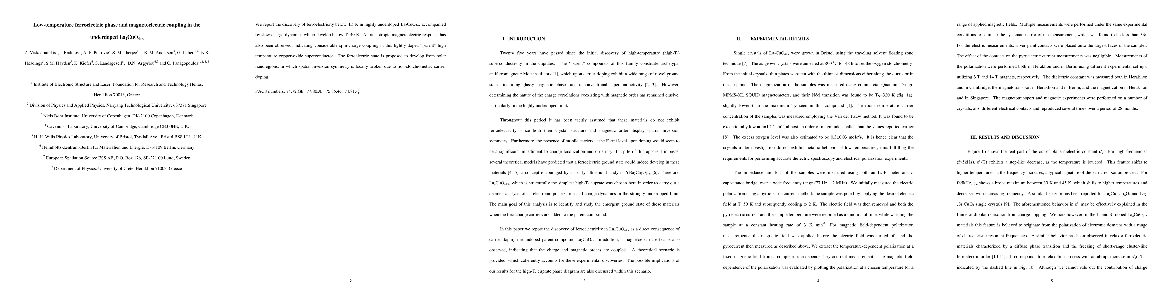 We report the discovery of a ferroelectric ground state below 4.5 K in highly underdoped La_2CuO_(4+x) accompanied by slow charge dynamics which develop below T~40 K. An anisotropic magnetoelectric response has also been observed, indicating considerable spin-charge coupling in this lightly doped "parent" high temperature copper-oxide superconductor. The ferroelectric state is proposed to develop from polar nanoregions, in which spatial inversion symmetry is locally broken due to non-stoichiometric carrier doping.