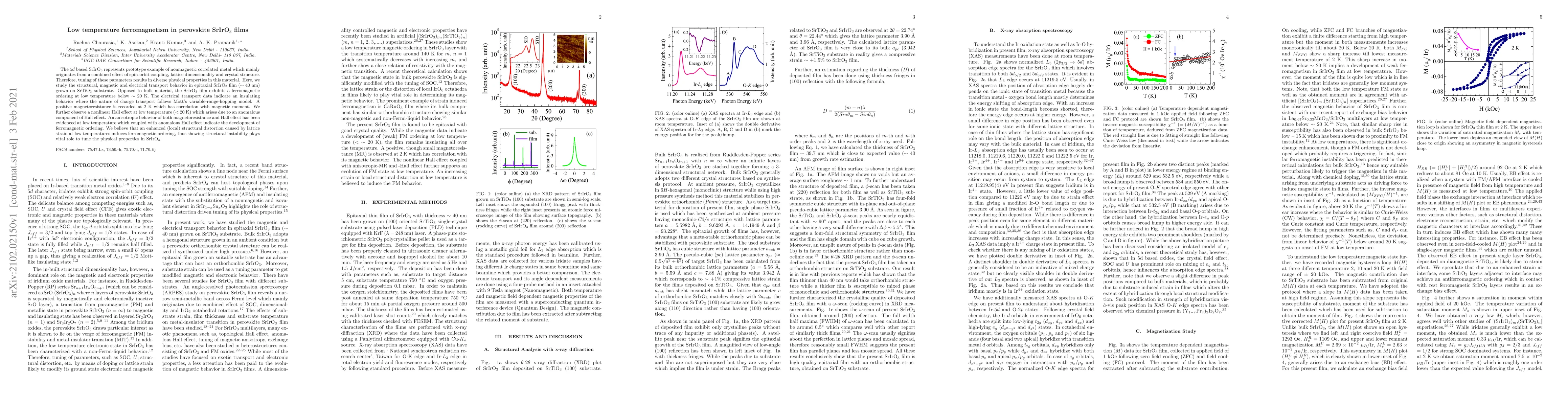 The 5$d$ based SrIrO$_3$ represents prototype example of nonmagnetic correlated metal which mainly originates from a combined effect of spin-orbit coupling, lattice dimensionality and crystal structure. Therefore, tuning of these parameters results in diverse physical properties in this material. Here, we study the structural, magnetic and electrical transport behavior in epitaxial SrIrO$_3$ film ($\sim$ 40 nm) grown on SrTiO$_3$ substrate. Opposed to bulk material, the SrIrO$_3$ film exhibits a ferromagnetic ordering at low temperature below $\sim$ 20 K. The electrical transport data indicate an insulating behavior where the nature of charge transport follows Mott's variable-range-hopping model. A positive magnetoresistance is recorded at 2 K which has correlation with magnetic moment. We further observe a nonlinear Hall effect at low temperature ($<$ 20 K) which arises due to an anomalous component of Hall effect. An anisotropic behavior of both magnetoresistance and Hall effect has been evidenced at low temperature which coupled with anomalous Hall effect indicate the development of ferromagnetic ordering. We believe that an enhanced (local) structural distortion caused by lattice strain at low temperatures induces ferromagnetic ordering, thus showing structural instability plays vital role to tune the physical properties in SrIrO$_3$.