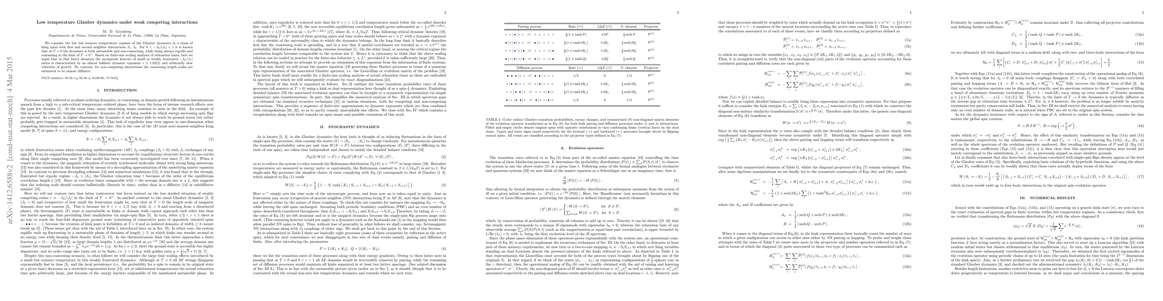 Research on Glauber dynamics at low temperatures with competing interactions reveals almost ballistic dynamics and arbitrarily slow velocity growth for certain ratios of $J_2/ | J_1 |$, contrasting with almost diffusive coarsening length scales in non-competing interactions.