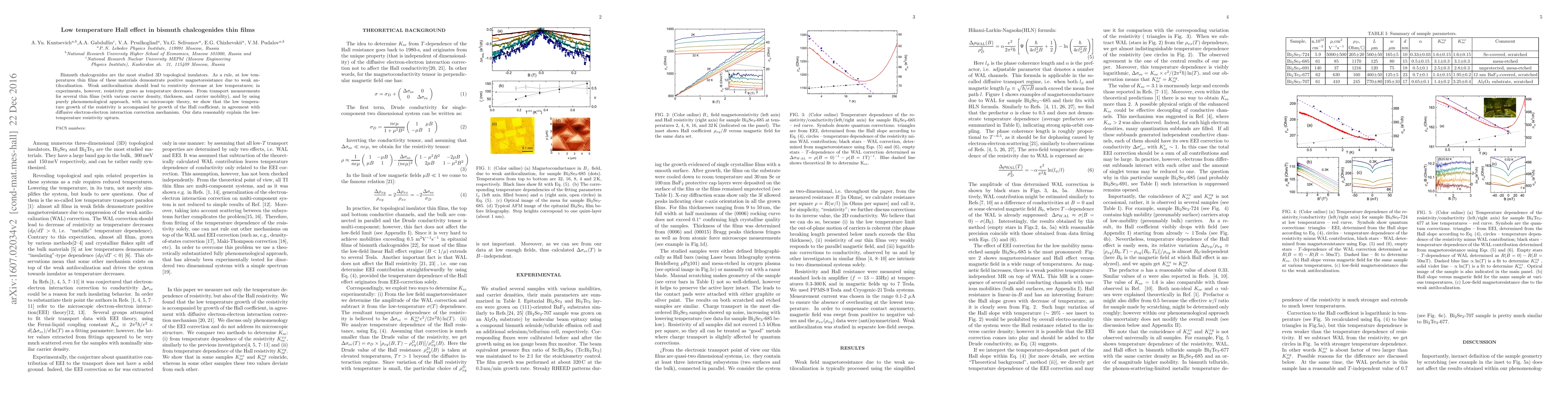 This study investigates the low-temperature Hall effect in bismuth chalcogenides thin films, revealing that resistivity increases with decreasing temperature despite expected weak antilocalization. Experimental data show a concurrent rise in the Hall coefficient, suggesting that diffusive electron-electron interaction corrections can explain the observed resistivity upturn.