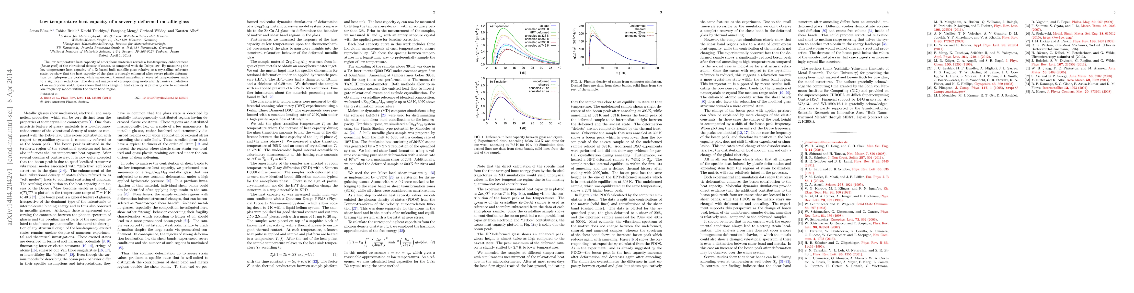 This paper investigates the low-temperature heat capacity of a severely deformed Zr-based metallic glass, finding that it is significantly enhanced compared to its crystalline counterpart due to increased low-frequency vibrational modes, particularly in shear band regions, with subsequent annealing reducing this enhancement. Molecular dynamics simulations corroborate these findings.
