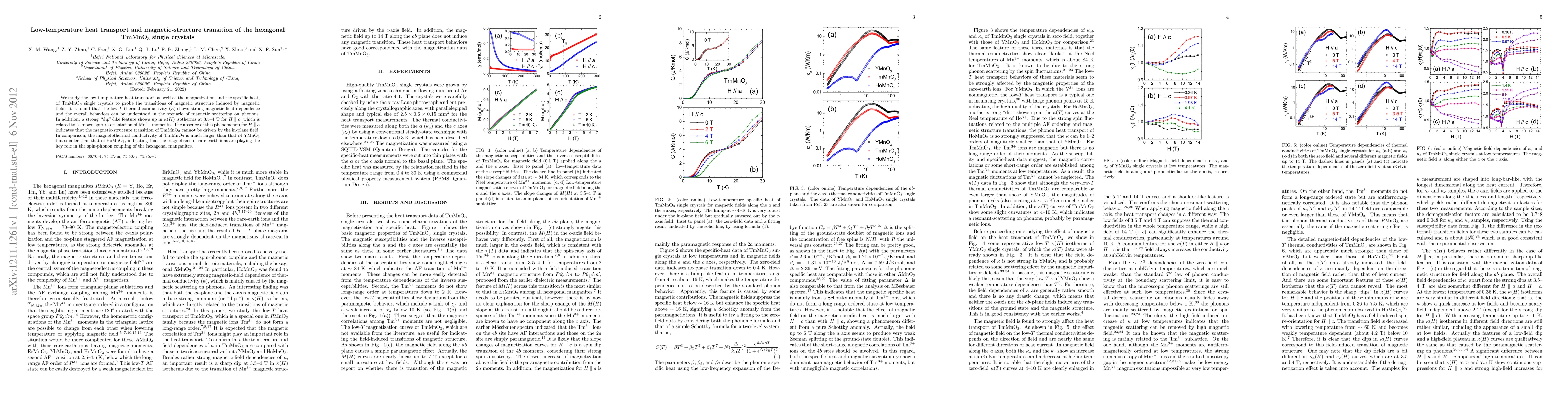 The study examines heat transport and magnetic properties of TmMnO_3 crystals, revealing strong magnetic-field dependence in low-temperature thermal conductivity (kappa). This behavior is attributed to magnetic scattering on phonons, with a distinct 'dip'-like feature in kappa(H) isotherms linked to Mn^3+ moment spin re-orientation for fields along the c-axis. The research underscores the significant role of rare-earth ions' magnetism in spin-phonon coupling within hexagonal manganites.