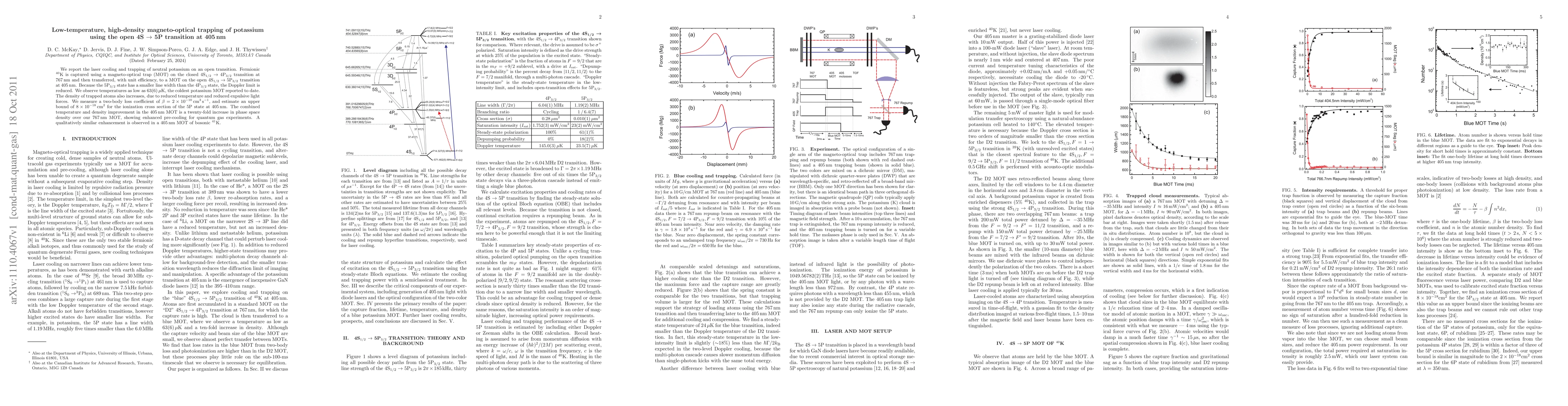This paper reports the laser cooling and trapping of neutral potassium atoms using a magneto-optical trap on the open 4S-5P transition at 405 nm, achieving temperatures as low as 63(6) microkelvin, the coldest potassium MOT to date. The study shows a twenty-fold increase in phase space density compared to a trap at 767 nm, enhancing pre-cooling for quantum gas experiments.