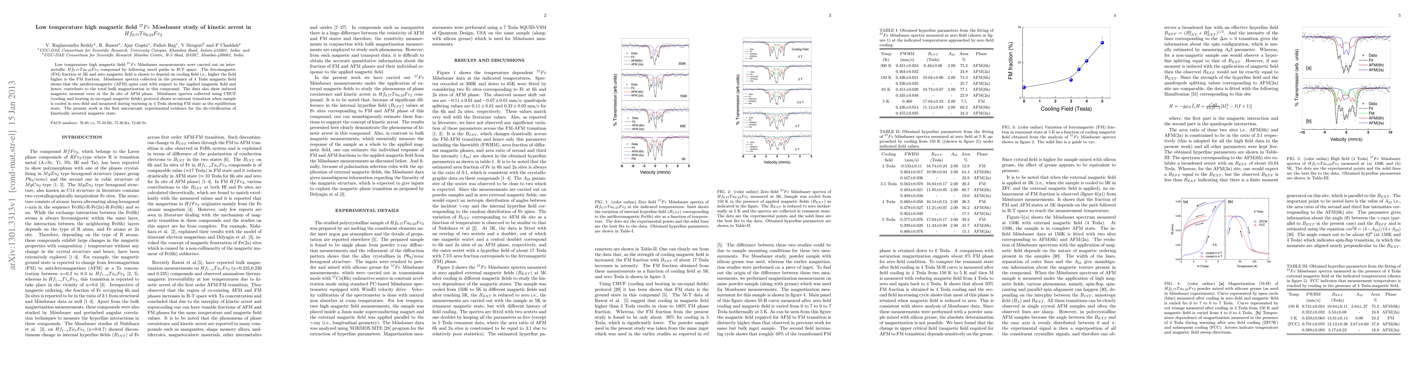 Low temperature high magnetic field $^{57}Fe$ M$\ddot{o}$ssbauer measurements were carried out on inter-metallic $Hf_{0.77}Ta_{0.23}Fe_2$ compound by following novel paths in H-T space. The ferromagnetic (FM) fraction at 5K and zero magnetic field is shown to depend on cooling field i.e., higher the field higher is the FM fraction. M$\ddot{o}$ssbauer spectra collected in the presence of 4 Tesla magnetic field shows that the antiferromagnetic (AFM) spins cant with respect to the applied magnetic field and hence, contribute to the total bulk magnetization in this compound. The data also show induced magnetic moment even at the 2a site of AFM phase. M$\ddot{o}$ssbauer spectra collected using CHUF (cooling and heating in un-equal magnetic fields) protocol shows re-entrant transition when sample is cooled in zero field and measured during warming in 4 Tesla showing FM state as the equilibrium state. The present work is the first microscopic experimental evidence for the de-vitrification of kinetically arrested magnetic state.