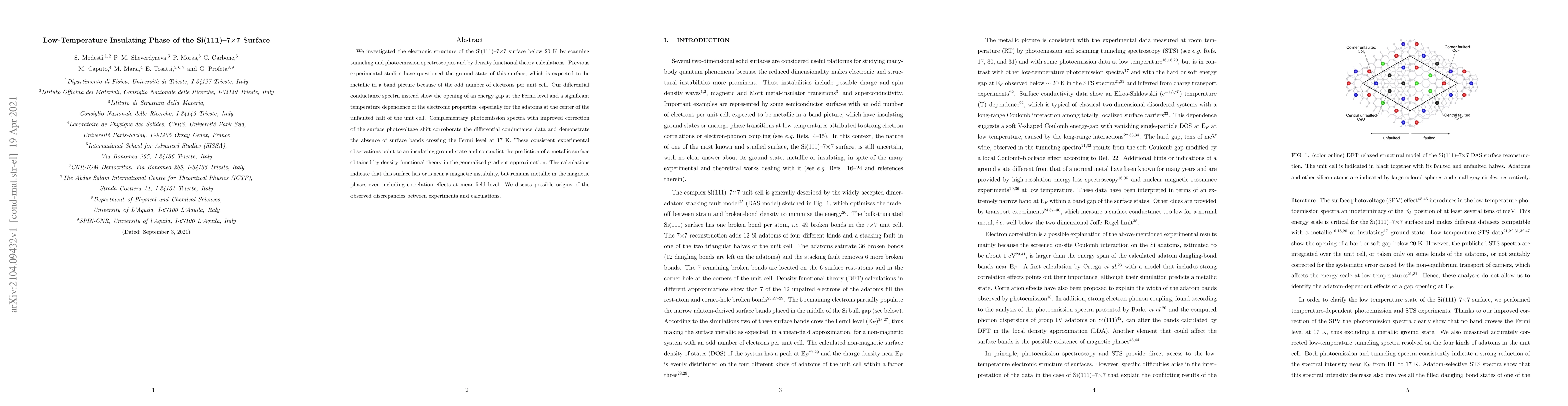 We investigated the electronic structure of the Si(111)--7$\times$7 surface below 20 K by scanning tunneling and photoemission spectroscopies and by density functional theory calculations. Previous experimental studies have questioned the ground state of this surface, which is expected to be metallic in a band picture because of the odd number of electrons per unit cell. Our differential conductance spectra instead show the opening of an energy gap at the Fermi level and a significant temperature dependence of the electronic properties, especially for the adatoms at the center of the unfaulted half of the unit cell. Complementary photoemission spectra with improved correction of the surface photovoltage shift corroborate the differential conductance data and demonstrate the absence of surface bands crossing the Fermi level at 17 K. These consistent experimental observations point to an insulating ground state and contradict the prediction of a metallic surface obtained by density functional theory in the generalized gradient approximation. The calculations indicate that this surface has or is near a magnetic instability, but remains metallic in the magnetic phases even including correlation effects at mean-field level. We discuss possible origins of the observed discrepancies between experiments and calculations.