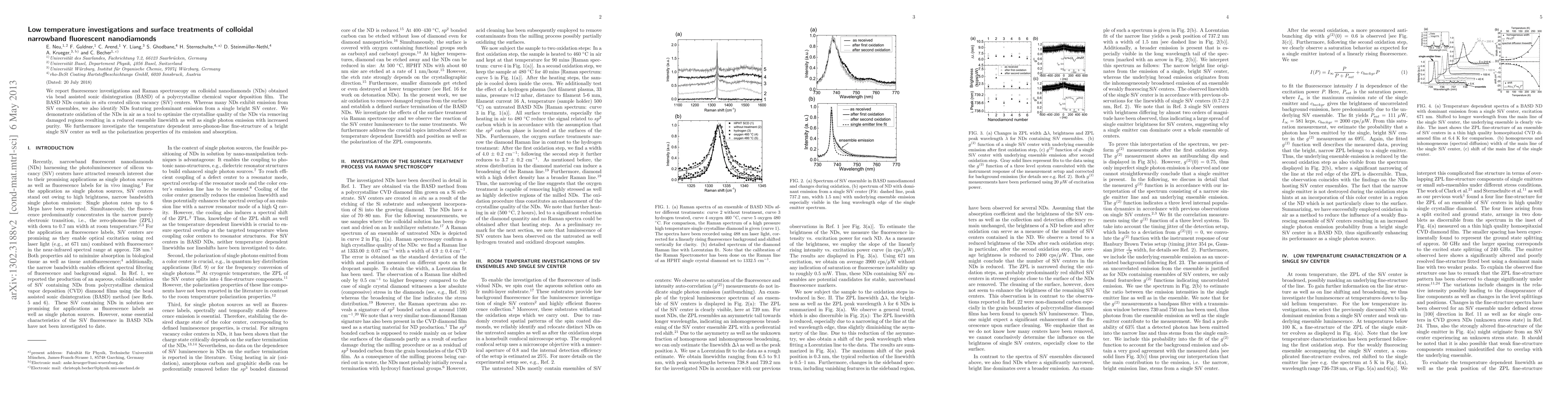 This study investigates colloidal narrowband fluorescent nanodiamonds (NDs) produced by bead-assisted sonic disintegration, focusing on their SiV centers. The research highlights the optimization of NDs through air oxidation, improving crystalline quality and enhancing single photon emission purity, and explores the temperature-dependent properties of bright single SiV centers.