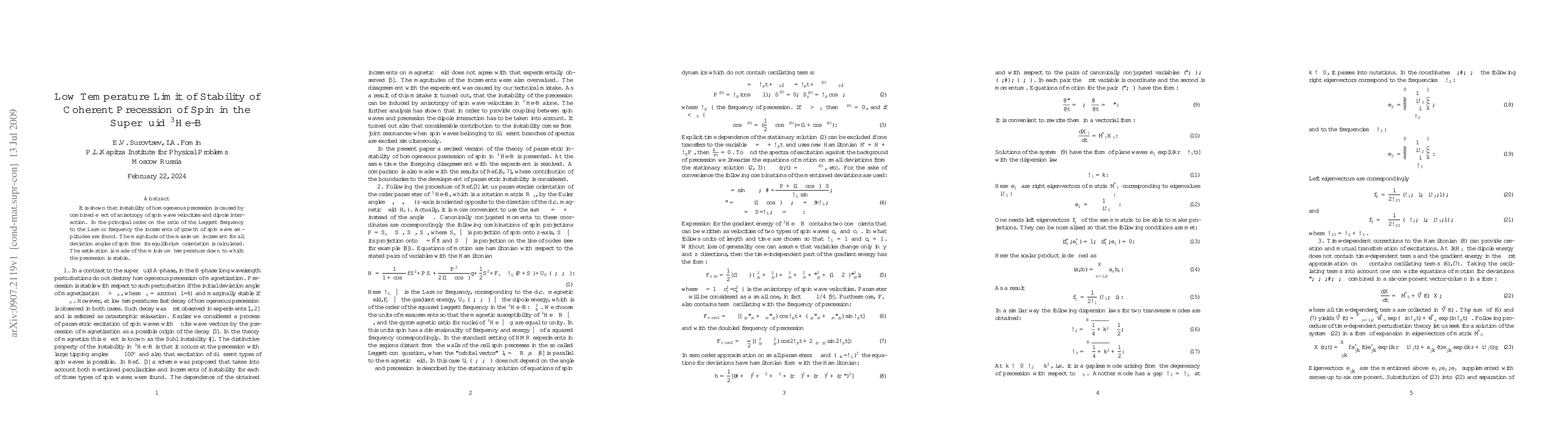 Researchers investigated the stability of spin precession in 3He-B superfluids at low temperatures, revealing that instability arises from a combination of spin wave velocity anisotropy and dipole interactions, with maximum growth occurring at specific angles.