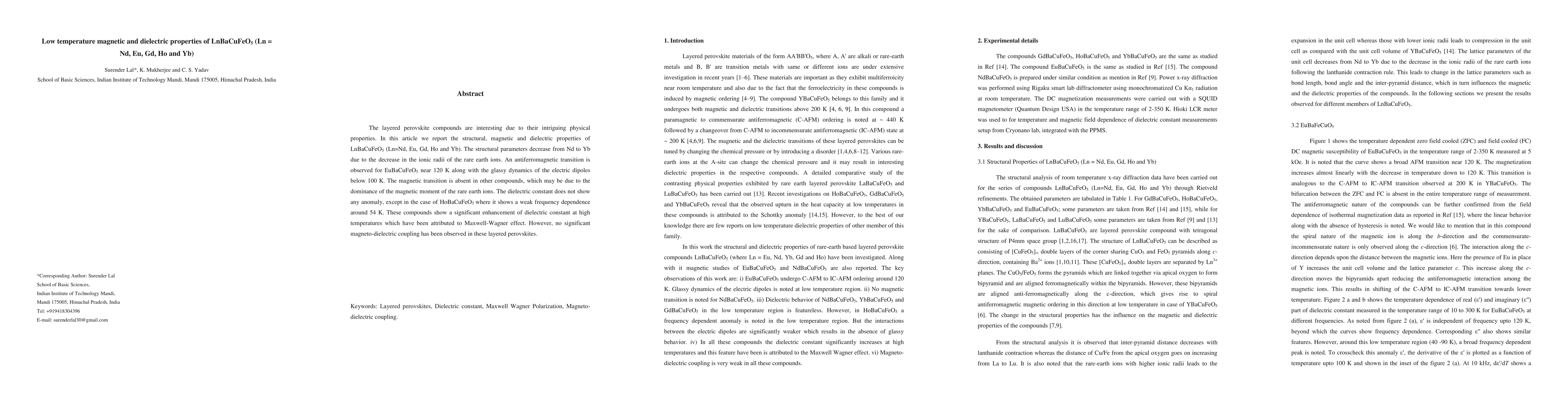 This study investigates the low-temperature magnetic and dielectric properties of LnBaCuFeO5 (Ln = Nd, Eu, Gd, Ho, Yb) layered perovskites, finding antiferromagnetic behavior in EuBaCuFeO5 and a lack of magnetic transition in others due to rare earth ion effects. Dielectric constants show significant enhancement at high temperatures, attributed to the Maxwell-Wagner effect, with no notable magneto-dielectric coupling observed.