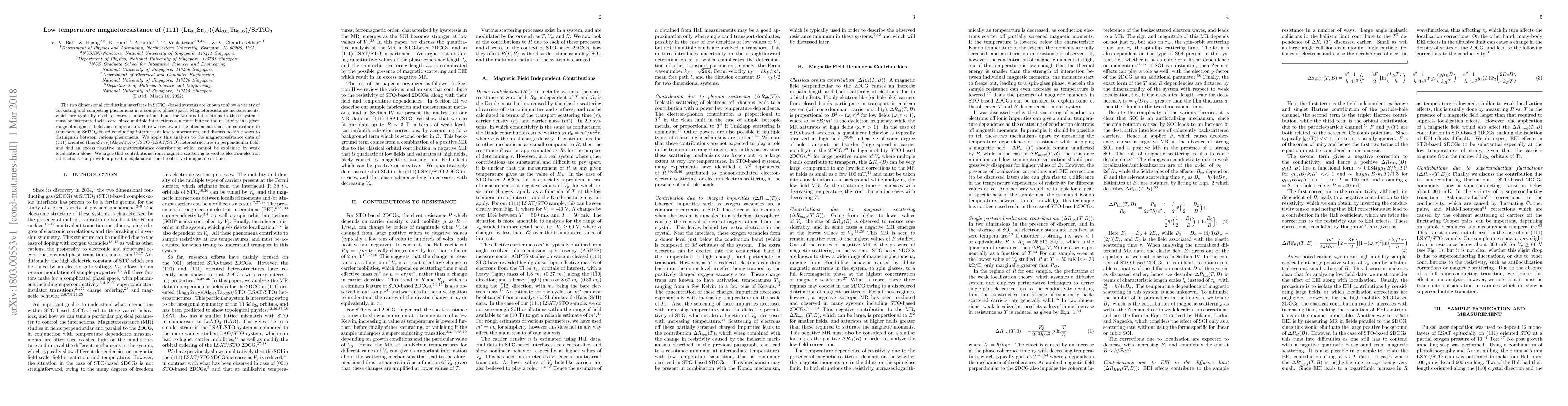 The two dimensional conducting interfaces in SrTiO$_3$-based systems are known to show a variety of coexisting and competing phenomena in a complex phase space. Magnetoresistance measurements, which are typically used to extract information about the various interactions in these systems, must be interpreted with care, since multiple interactions can contribute to the resistivity in a given range of magnetic field and temperature. Here we review all the phenomena that can contribute to transport in SrTiO$_3$-based conducting interfaces at low temperatures, and discuss possible ways to distinguish between various phenomena. We apply this analysis to the magnetoresistance data of (111) oriented (La$_{0.3}$Sr$_{0.7}$)(Al$_{0.65}$Ta$_{0.35}$)/STO (LSAT/STO) heterostructures in perpendicular field, and find an excess negative magnetoresistance contribution which cannot be explained by weak localization alone. We argue that contributions from magnetic scattering as well as electron-electron interactions can provide a possible explanation for the observed magnetoresistance.