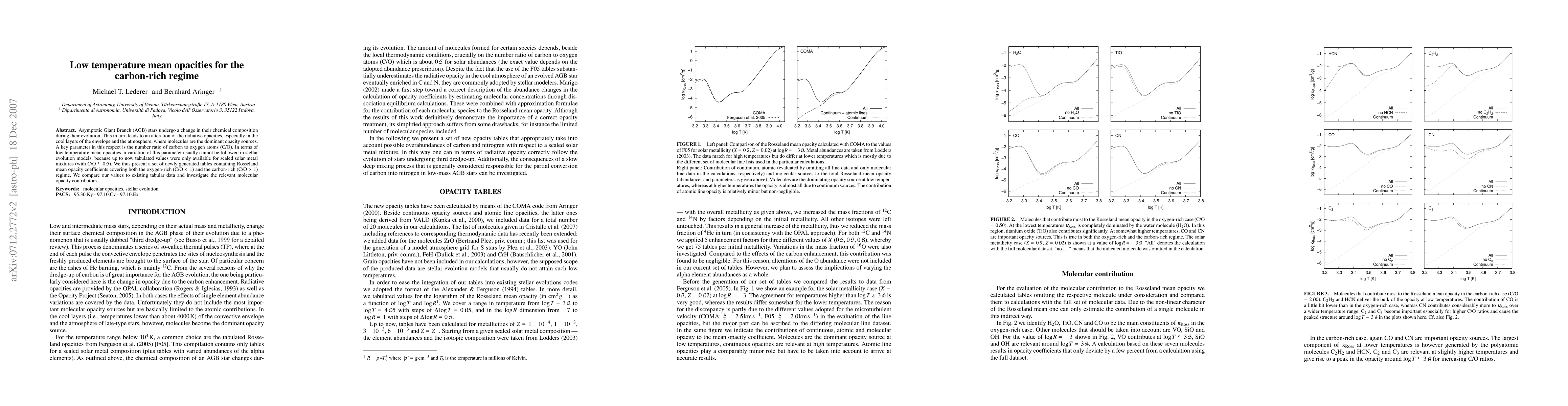 Asymptotic Giant Branch (AGB) stars undergo a change in their chemical composition during their evolution. This in turn leads to an alteration of the radiative opacities, especially in the cool layers of the envelope and the atmosphere, where molecules are the dominant opacity sources. A key parameter in this respect is the number ratio of carbon to oxygen atoms (C/O). In terms of low temperature mean opacities, a variation of this parameter usually cannot be followed in stellar evolution models, because up to now tabulated values were only available for scaled solar metal mixtures (with C/O ~ 0.5). We thus present a set of newly generated tables containing Rosseland mean opacity coefficients covering both the oxygen-rich (C/O < 1) and the carbon-rich (C/O > 1) regime. We compare our values to existing tabular data and investigate the relevant molecular opacity contributors.