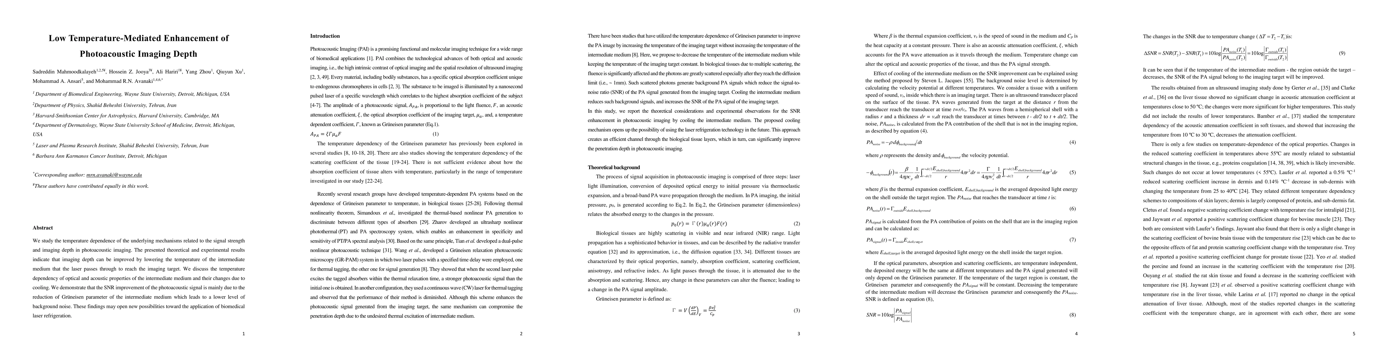 We study the temperature dependence of the underlying mechanisms related to the signal strength and imaging depth in photoacoustic imaging. The presented theoretical and experimental results indicate that imaging depth can be improved by lowering the temperature of the intermediate medium that the laser passes through to reach the imaging target. We discuss the temperature dependency of optical and acoustic properties of the intermediate medium and their changes due to cooling. We demonstrate that the SNR improvement of the photoacoustic signal is mainly due to the reduction of Gr\"uneisen parameter of the intermediate medium which leads to a lower level of background noise. These findings may open new possibilities toward the application of biomedical laser refrigeration.