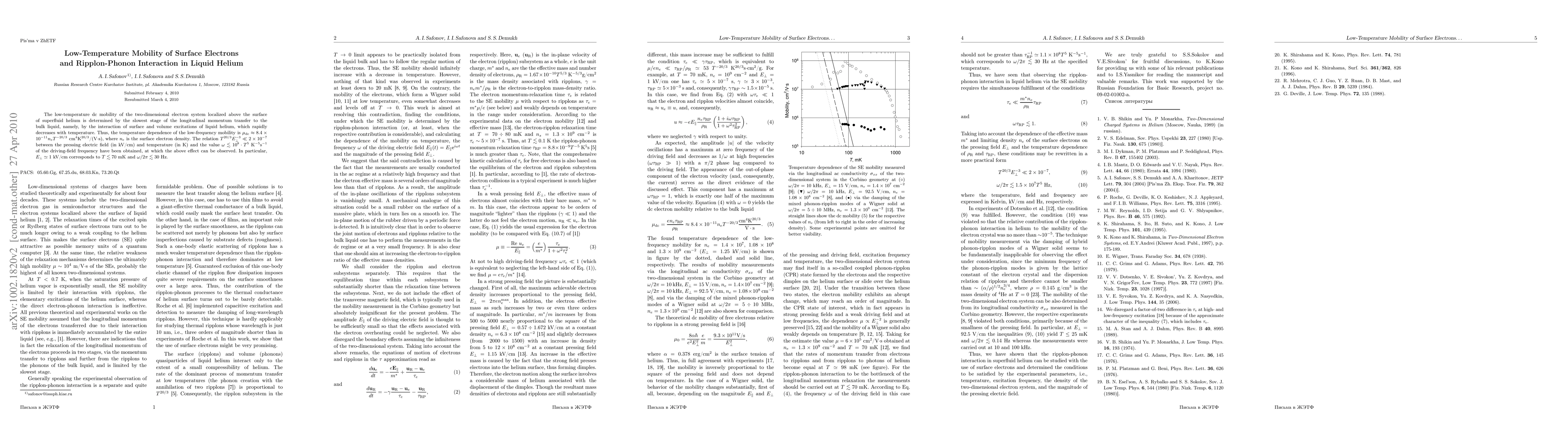 This study investigates the low-temperature dc mobility of surface electrons in superfluid helium, revealing a temperature-dependent relationship influenced by ripplon-phonon interactions. The mobility is described by \mu_{dc} = 8.4x10^{-11}n_e T^{-20/3} cm^4 K^{20/3}/(V s), where n_e is the electron density.