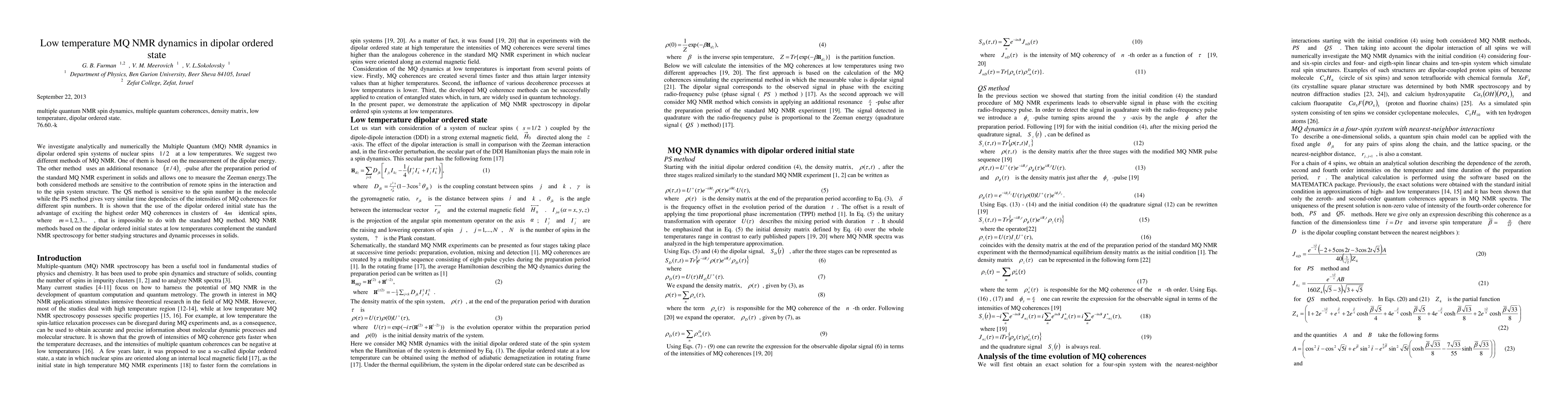 This paper explores two novel Multiple Quantum (MQ) NMR methods for studying dipolar ordered spin systems at low temperatures. These methods, based on dipolar and Zeeman energy measurements, enhance the detection of remote spin interactions and structural details, complementing standard NMR spectroscopy for better structural and dynamic analysis in solids.