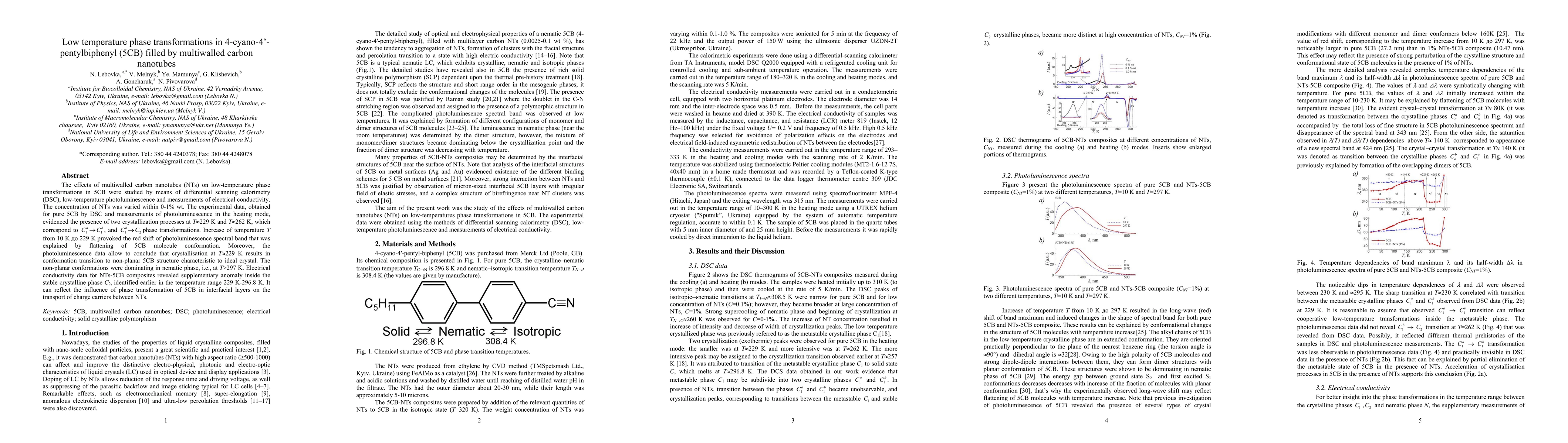 Researchers studied how adding multiwalled carbon nanotubes to 5CB affects its phase transformations at low temperatures, finding anomalies in electrical conductivity and insights into molecular conformation changes.