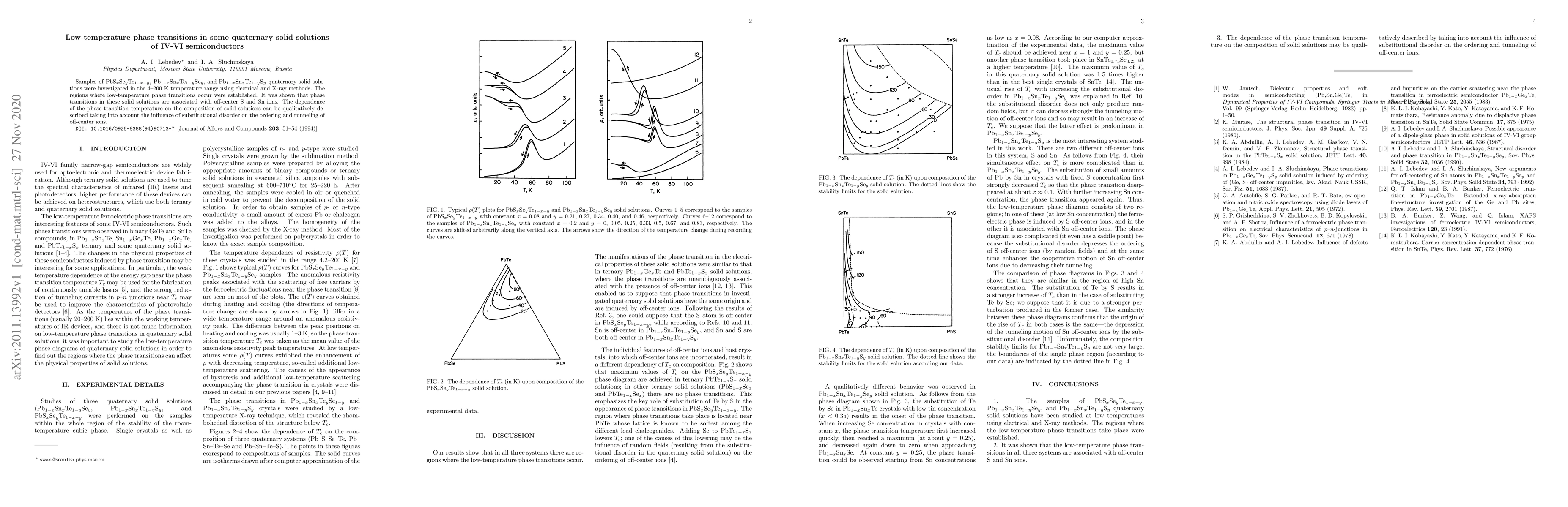 Samples of PbS$_x$Se$_y$Te$_{1-x-y}$, Pb$_{1-x}$Sn$_x$Te$_{1-y}$Se$_y$, and Pb$_{1-x}$Sn$_x$Te$_{1-y}$S$_y$ quaternary solid solutions were investigated in the 4--200~K temperature range using electrical and X-ray methods. The regions where low-temperature phase transitions occur were established. It was shown that phase transitions in these solid solutions are associated with off-center S and Sn ions. The dependence of the phase transition temperature on the composition of solid solutions can be qualitatively described taking into account the influence of substitutional disorder on the ordering and tunneling of off-center ions.