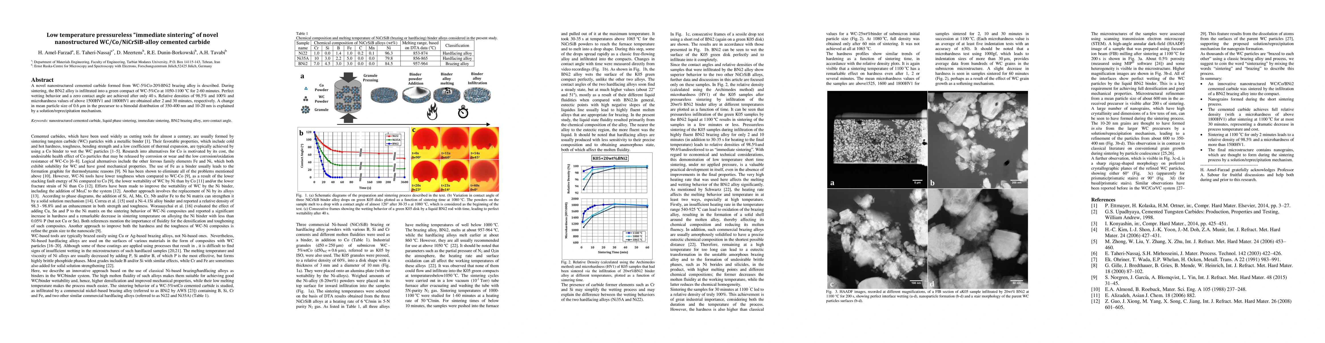 This paper investigates the low temperature pressureless sintering of a novel nanostructured WC/Co/BNi2 cemented carbide, achieving near-full density and high microhardness within minutes. The BNi2 alloy infiltration results in a bimodal particle size distribution and perfect wetting behavior.