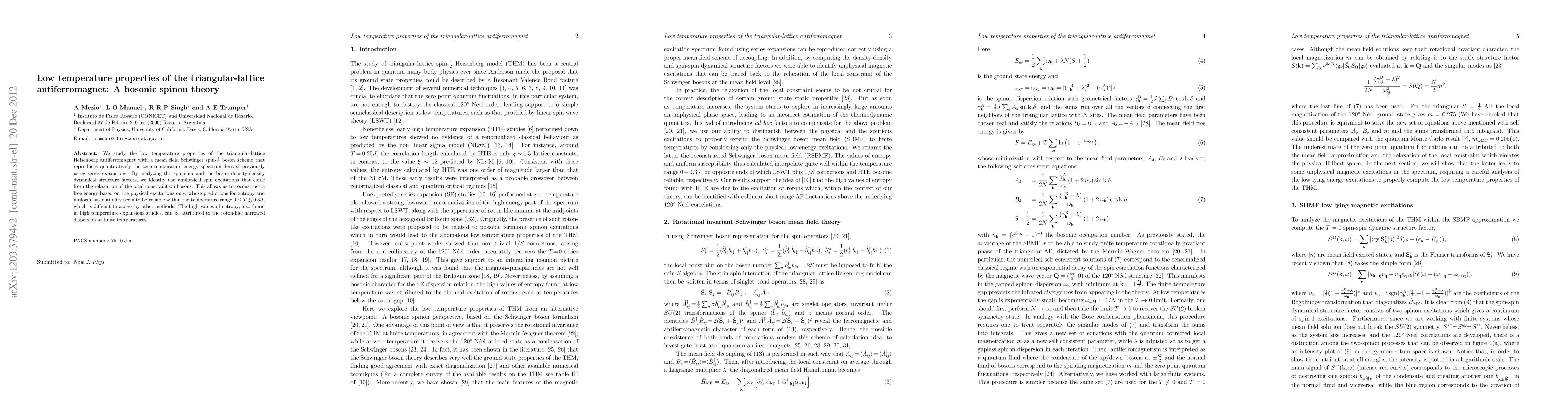 Researchers study low-temperature properties of a triangular-lattice antiferromagnet using a bosonic spin-1/2 model, identifying physical excitations and predicting reliable entropy and susceptibility within a specific temperature range.