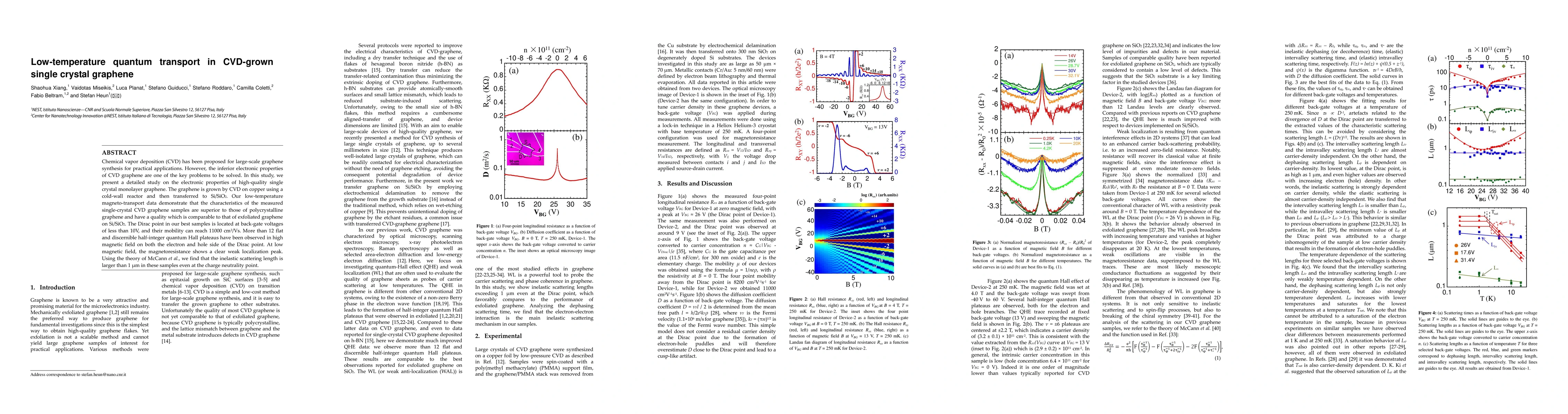 Chemical vapor deposition (CVD) has been proposed for large-scale graphene synthesis for practical applications. However, the inferior electronic properties of CVD graphene are one of the key problems to be solved. In this study, we present a detailed study on the electronic properties of high-quality single crystal monolayer graphene. The graphene is grown by CVD on copper using a cold-wall reactor and then transferred to Si/SiO2. Our low-temperature magneto-transport data demonstrate that the characteristics of the measured single-crystal CVD graphene samples are superior to those of polycrystalline graphene and have a quality which is comparable to that of exfoliated graphene on Si/SiO2. The Dirac point in our best samples is located at back-gate voltages of less than 10V, and their mobility can reach 11000 cm2/Vs. More than 12 flat and discernible half-integer quantum Hall plateaus have been observed in high magnetic field on both the electron and hole side of the Dirac point. At low magnetic field, the magnetoresistance shows a clear weak localization peak. Using the theory of McCann et al., we find that the inelastic scattering length is larger than 1 {\mu}m in these samples even at the charge neutrality point.