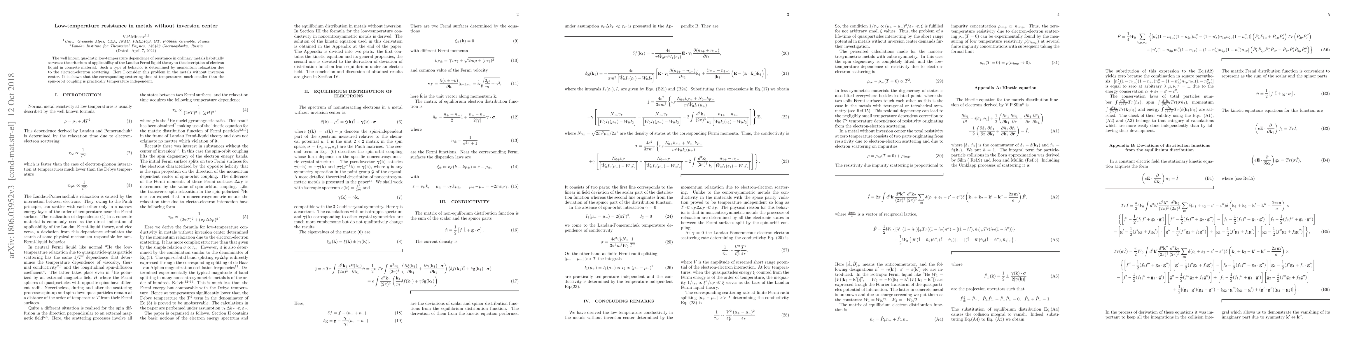 This paper examines the low-temperature resistance in metals lacking an inversion center, demonstrating that the electron scattering time is temperature-independent at low temperatures compared to spin-orbit coupling, deviating from the typical quadratic resistance dependence seen in ordinary metals.