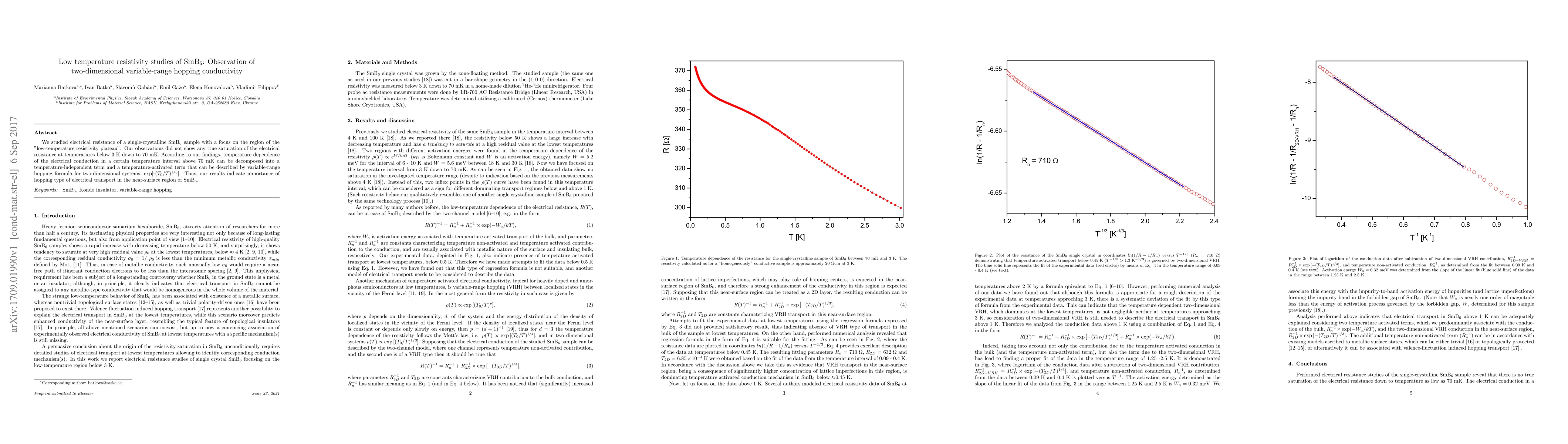 We studied electrical resistance of a single-crystalline SmB6 sample with a focus on the region of the "low-temperature resistivity plateau". Our observations did not show any true saturation of the electrical resistance at temperatures below 3 K down to 70 mK. According to our findings, temperature dependence of the electrical conduction in a certain temperature interval above 70 mK can be decomposed into a temperature-independent term and a temperature-activated term that can be described by variable-range hopping formula for two-dimensional systems, exp[-T0/T)^1/3]. Thus, our results indicate importance of hopping type of electrical transport in the near-surface region of SmB6.