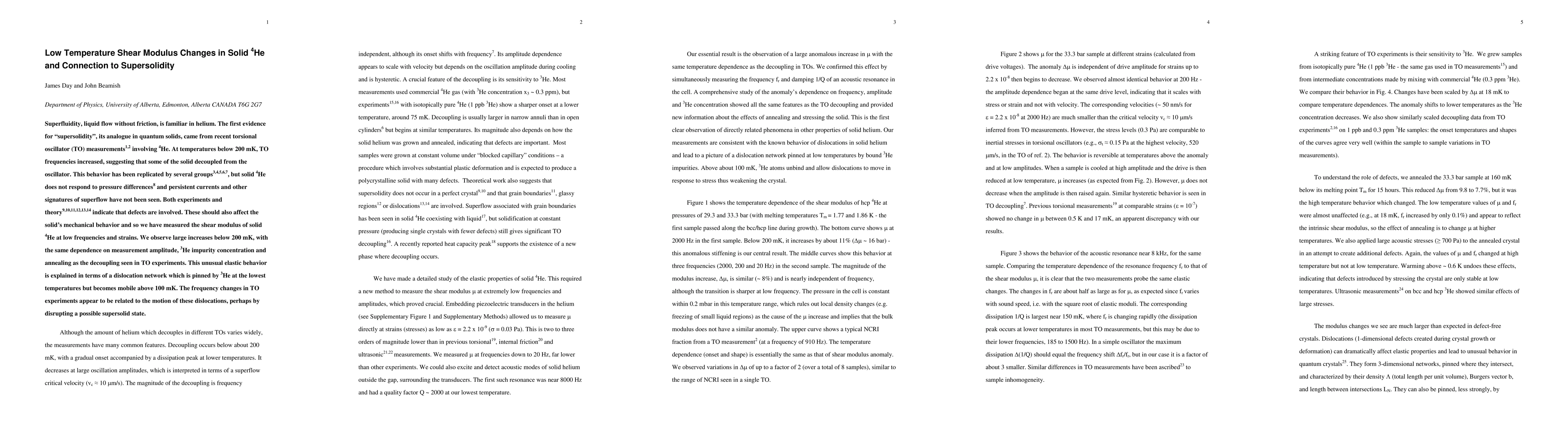This study investigates the low temperature shear modulus changes in solid 4-He, revealing significant increases below 200 mK linked to dislocation networks pinned by 3-He impurities. These findings correlate with torsional oscillator observations of supersolidity, suggesting dislocation motion may disrupt a potential supersolid state.