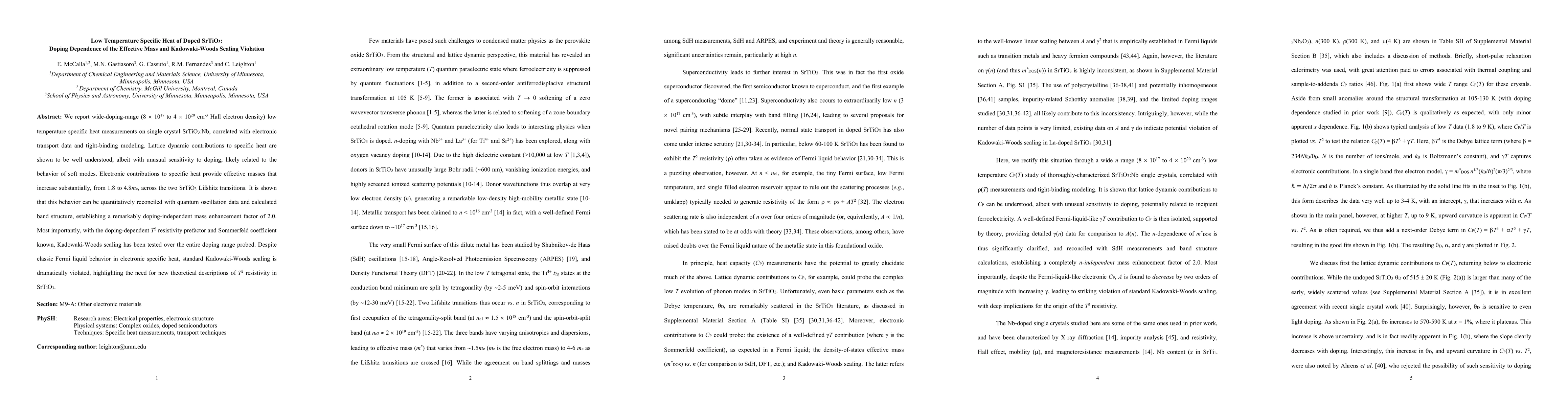 We report wide-doping-range ($8 \times 10^{17}$ to $4 \times 10^{20}$ cm$^{-3}$ Hall electron density) low temperature specific heat measurements on single crystal SrTiO$_3$:Nb, correlated with electronic transport data and tight-binding modeling. Lattice dynamic contributions to specific heat are shown to be well understood, albeit with unusual sensitivity to doping, likely related to the behavior of soft modes. Electronic contributions to specific heat provide effective masses that increase substantially, from $1.8$ to $4.8 m_e$, across the two SrTiO$_3$ Lifshitz transitions. It is shown that this behavior can be quantitatively reconciled with quantum oscillation data and calculated band structure, establishing a remarkably doping-independent mass enhancement factor of $2.0$. Most importantly, with the doping-dependent $T^2$ resistivity prefactor and Sommerfeld coefficient known, Kadowaki-Woods scaling has been tested over the entire doping range probed. Despite classic Fermi liquid behavior in electronic specific heat, standard Kadowaki-Woods scaling is dramatically violated, highlighting the need for new theoretical descriptions of $T^2$ resistivity in SrTiO$_3$.
