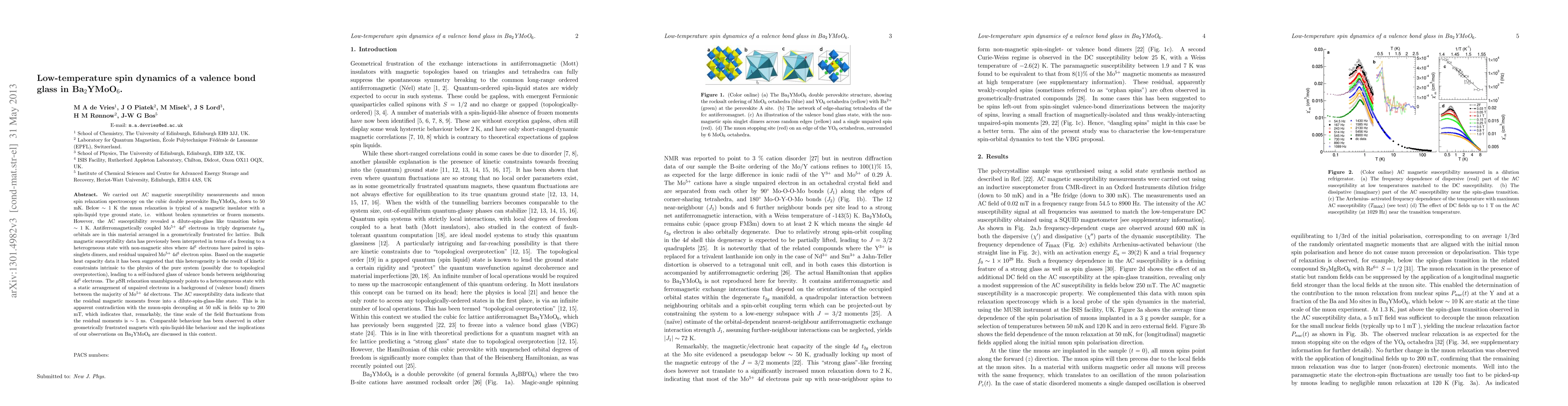 We carried out AC magnetic susceptibility measurements and muon spin relaxation spectroscopy on the cubic double perovskite Ba2YMoO6, down to 50 mK. Below ~1 K the muon relaxation is typical of a magnetic insulator with a spin-liquid type ground state, i.e. without broken symmetries or frozen moments. However, the AC susceptibility revealed a dilute-spin-glass like transition below ~ 1 K. Antiferromagnetically coupled Mo5+ 4d1 electrons in triply degenerate t2g orbitals are in this material arranged in a geometrically frustrated fcc lattice. Bulk magnetic susceptibility data has previously been interpreted in terms of a freezing to a heterogeneous state with non-magnetic sites where 4d^1 electrons have paired in spin-singlets dimers, and residual unpaired Mo5+ 4d1 electrons. Based on the magnetic heat capacity data it has been suggested that this heterogeneity is the result of kinetic constraints intrinsic to the physics of the pure system (possibly due to topological overprotection), leading to a self-induced glass of valence bonds between neighbouring 4d1 electrons. The muSR relaxation unambiguously points to a static heterogeneous state with a static arrangement of unpaired electrons isolated by spin-singlet (valence bond) dimers between the majority of Mo5+ 4d electrons. The AC susceptibility data indicate that the residual magnetic moments freeze into a dilute-spin-glass-like state. This is in apparent contradiction with the muon-spin decoupling at 50 mK in fields up to 200 mT, which indicates that, remarkably, the time scale of the field fluctuations from the residual moments is ~ 5 ns. Comparable behaviour has been observed in other geometrically frustrated magnets with spin-liquid-like behaviour and the implications of our observations on Ba2YMoO6 are discussed in this context.