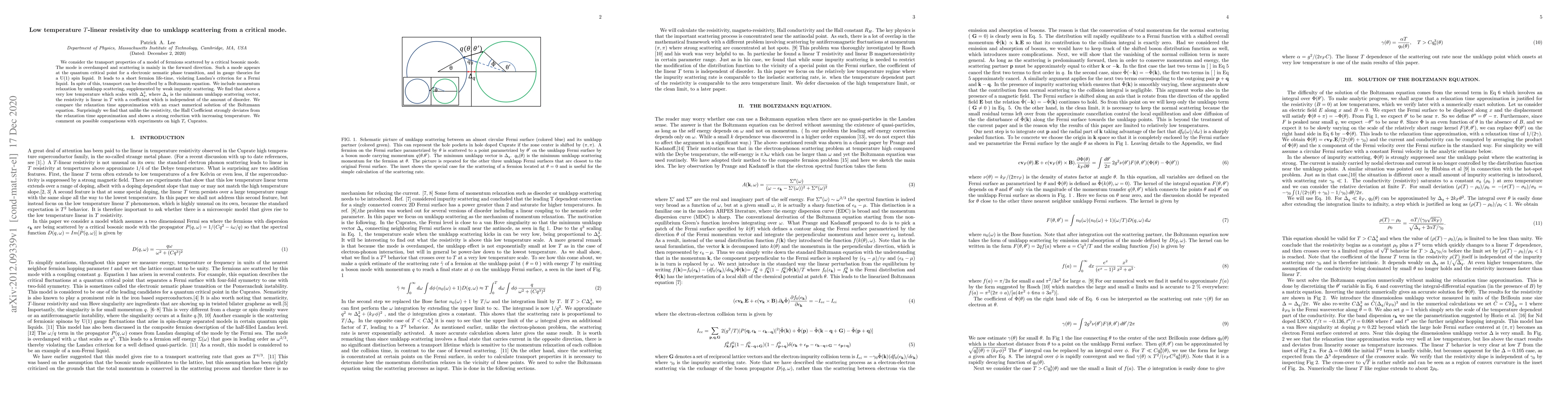 The study explores fermion transport in a model where scattering by a critical bosonic mode leads to low temperature $T$-linear resistivity due to umklapp scattering, finding the resistivity coefficient is independent of disorder, while the Hall coefficient deviates significantly from the relaxation time approximation. Possible experimental implications for high $T_c$ Cuprates are discussed.