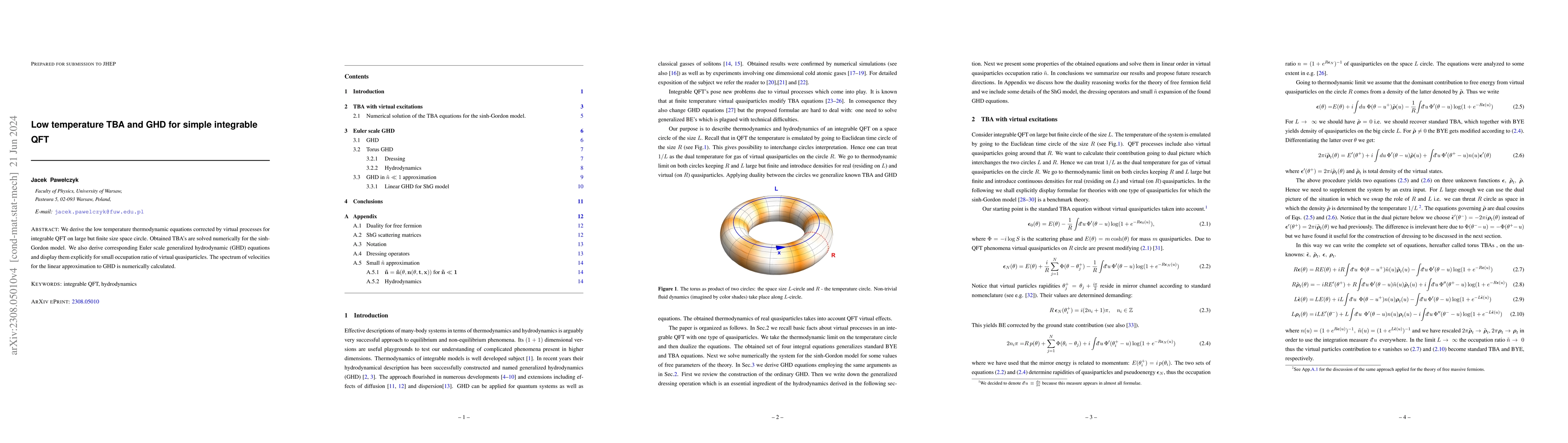 We derive the low temperature thermodynamic equations corrected by virtual processes for integrable QFT on large but finite size space circle. Obtained TBA's are solved numerically for the sinh-Gordon model. We also derive corresponding Euler scale generalized hydrodynamic (GHD) equations and display them explicitly for small occupation ratio of virtual quasiparticles. The spectrum of velocities for the linear approximation to GHD is numerically calculated.