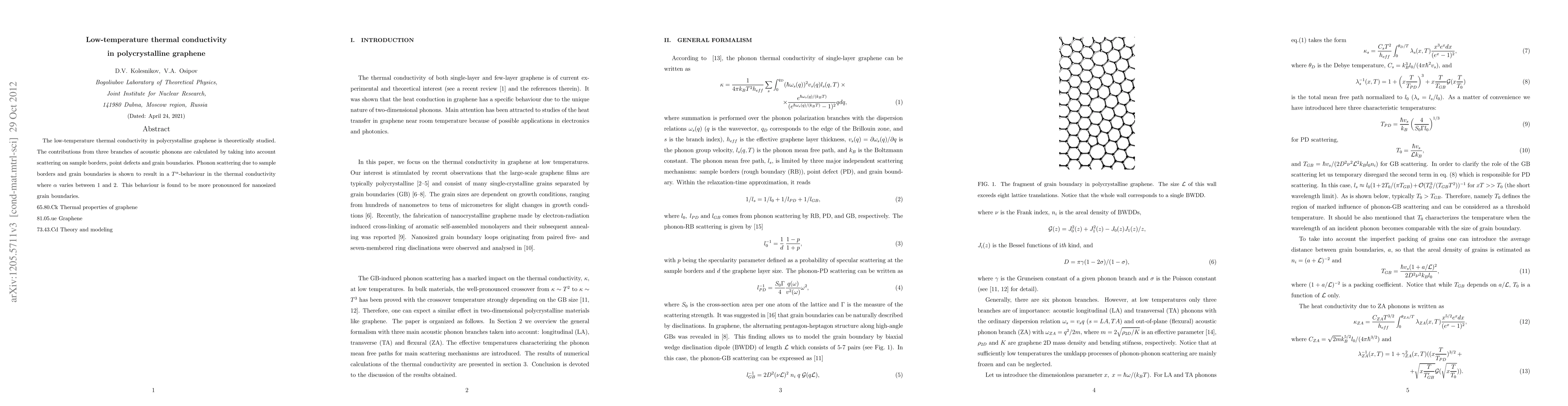 Summary: This study theoretically investigates low-temperature thermal conductivity in polycrystalline graphene, showing that phonon scattering from sample borders and grain boundaries leads to a $T^{\alpha}$-dependence in thermal conductivity, with $\alpha$ between 1 and 2, more significant in nanosized grain boundaries.