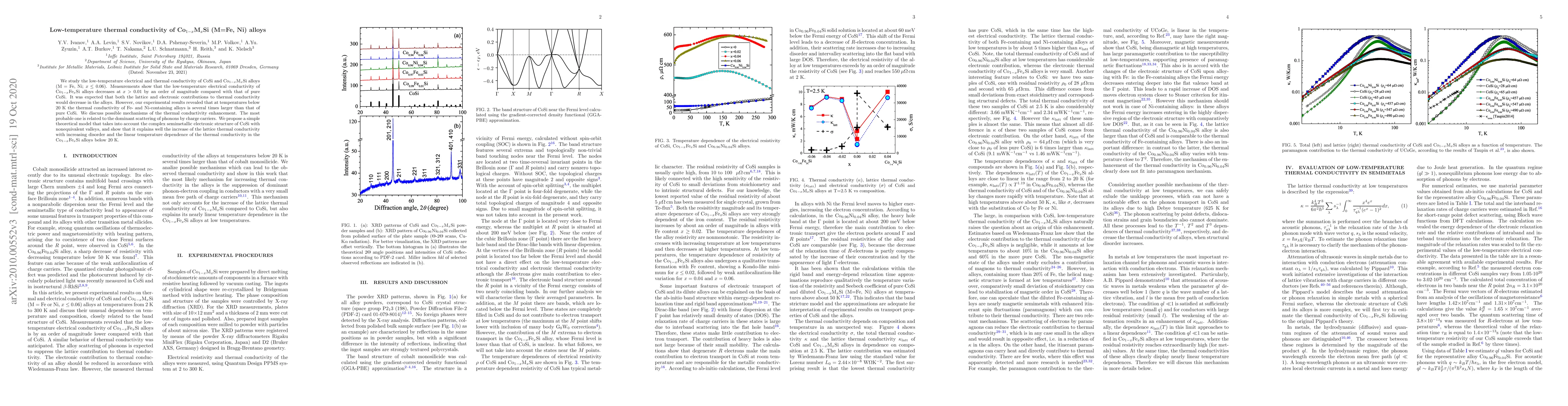 The study investigates the low-temperature thermal conductivity of CoSi and Co$_{1-x}$M$_x$Si alloys (M = Fe, Ni; $x \leq$ 0.06), finding that Fe and Ni doping increases thermal conductivity significantly below 20K despite a substantial decrease in electrical conductivity. The enhancement is likely due to dominant phonon scattering by charge carriers, supported by a theoretical model that accounts for CoSi's semimetallic structure.