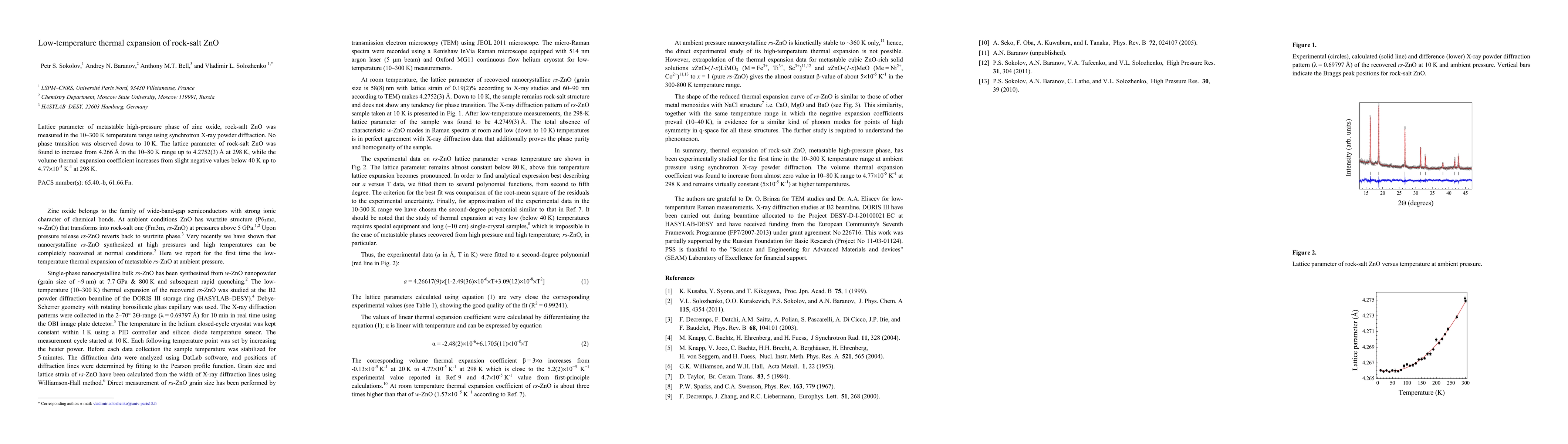 This study investigates the low-temperature thermal expansion of rock-salt ZnO using synchrotron X-ray powder diffraction, finding no phase transition down to 10 K. The lattice parameter increases from 4.266 Å at 10 K to 4.2752(3) Å at 298 K, with the volume thermal expansion coefficient rising from slight negative values below 40 K to 4.77×10^-5 K^-1 at room temperature.