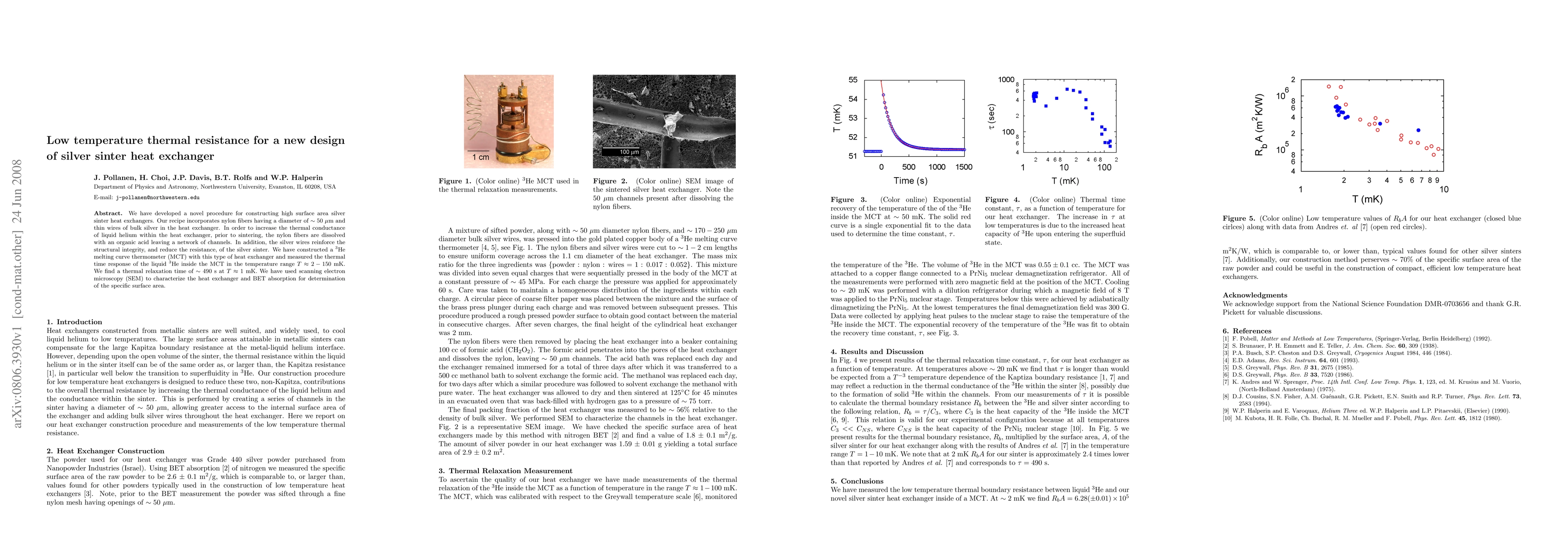 This paper presents a novel high surface area silver sinter heat exchanger design incorporating nylon fibers and silver wires to enhance thermal conductance and structural integrity. The thermal response of liquid 3-He in the exchanger at low temperatures (2-150 mK) shows a relaxation time of ~490 s at 1 mK.