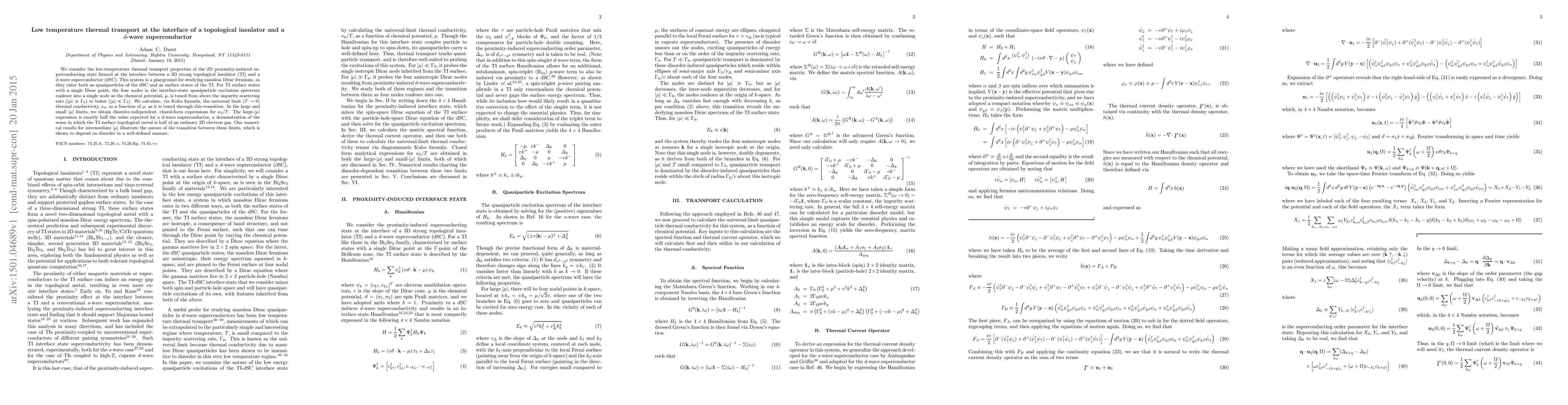 We consider the low-temperature thermal transport properties of the 2D proximity-induced superconducting state formed at the interface between a 3D strong topological insulator (TI) and a d-wave superconductor (dSC). This system is a playground for studying massless Dirac fermions, as they enter both as quasiparticles of the dSC and as surface states of the TI. For TI surface states with a single Dirac point, the four nodes in the interface-state quasiparticle excitation spectrum coalesce into a single node as the chemical potential, $\mu$, is tuned from above the impurity scattering rate ($|\mu| \gg \Gamma_0$) to below ($|\mu| \ll \Gamma_0$). We calculate, via Kubo formula, the universal limit ($T \rightarrow 0$) thermal conductivity, $\kappa_0$, as a function of $\mu$, as it is tuned through this transition. In the large and small $|\mu|$ limits, we obtain disorder-independent, closed-form expressions for $\kappa_0/T$. The large-$|\mu|$ expression is exactly half the value expected for a d-wave superconductor, a demonstration of the sense in which the TI surface topological metal is half of an ordinary 2D electron gas. Our numerical results for intermediate $|\mu|$ illustrate the nature of the transition between these limits, which is shown to depend on disorder in a well-defined manner.