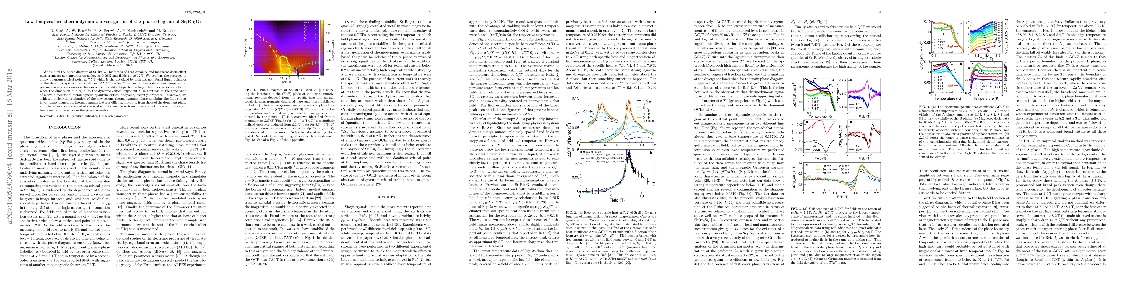 We studied the phase diagram of Sr$_3$Ru$_2$O$_7$ by means of heat capacity and magnetocaloric effect measurements at temperatures as low as 0.06 K and fields up to 12 T. We confirm the presence of a new quantum critical point at 7.5 T which is characterized by a strong non-Fermi-liquid behavior of the electronic specific heat coefficient $\Delta$C/T $\sim$ -logT over more than a decade in temperature,placing strong constraints on theories of its criticality. In particular logarithmic corrections are found when the dimension d is equal to the dynamic critical exponent z, in contrast to the conclusion proposed recently [Y. Tokiwa et al., Phys. Rev. Lett. 116, 226402 (2016)]. Moreover, we achieved a clear determination of the new second thermodynamic phase adjoining the first one at lower temperatures. Its thermodynamic features differ significantly from those of the dominant phase and characteristics expected of classical equilibrium phase transitions are not observed, indicating fundamental differences in the phase formation.