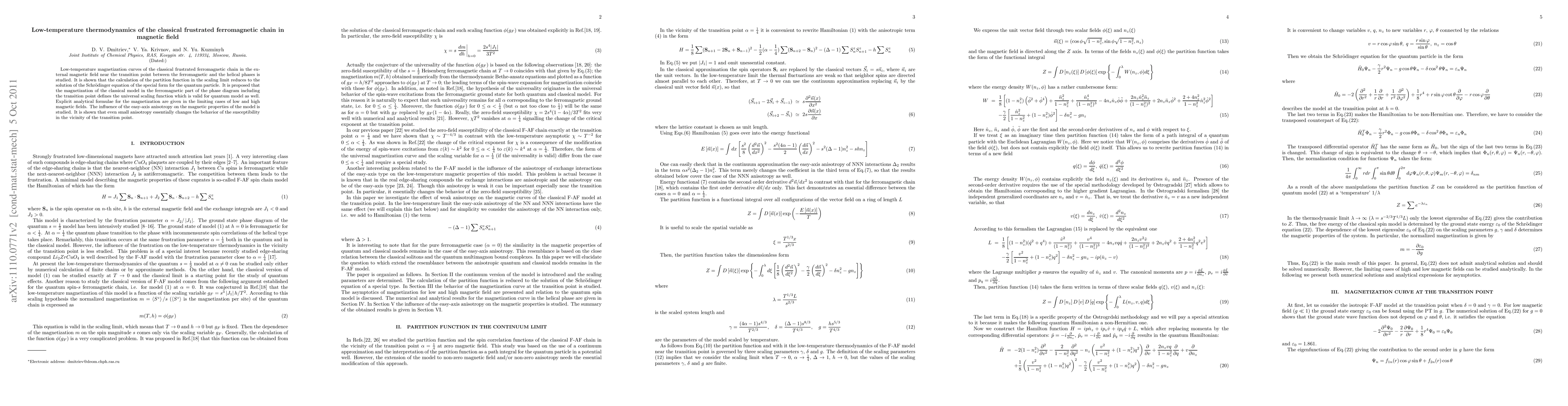 This paper investigates the low-temperature magnetization of a frustrated ferromagnetic chain under an external magnetic field, revealing a universal scaling function for both classical and quantum models. It also examines the impact of easy-axis anisotropy on the magnetic properties, showing significant changes near the transition point between ferromagnetic and helical phases.