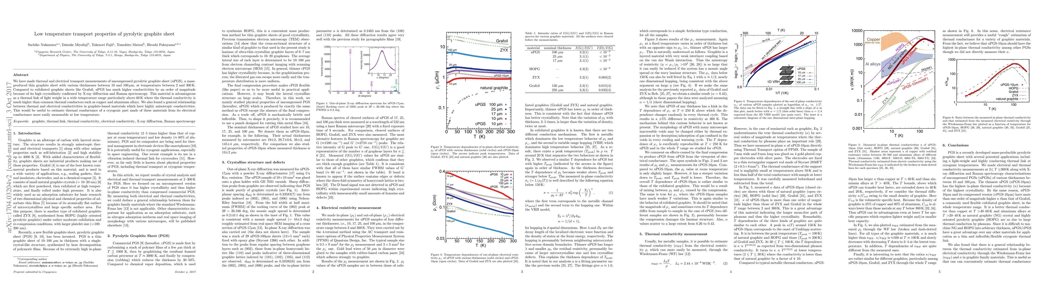 We have made thermal and electrical transport measurements of uncompressed pyrolytic graphite sheet (uPGS), a mass-produced thin graphite sheet with various thicknesses between 10 and 100 {\mu}m, at temperatures between 2 and 300 K. Compared to exfoliated graphite sheets like Grafoil, uPGS has much higher conductivities by an order of magnitude because of its high crystallinity confirmed by X-ray diffraction and Raman spectroscopy. This material is advantageous as a thermal link of light weight in a wide temperature range particularly above 60 K where the thermal conductivity is much higher than common thermal conductors such as copper and aluminum alloys. We also found a general relationship between thermal and electrical conductivities in graphite-based materials which have highly anisotropic conductivities. This would be useful to estimate thermal conductance of a cryogenic part made of these materials from its electrical conductance more easily measurable at low temperature.