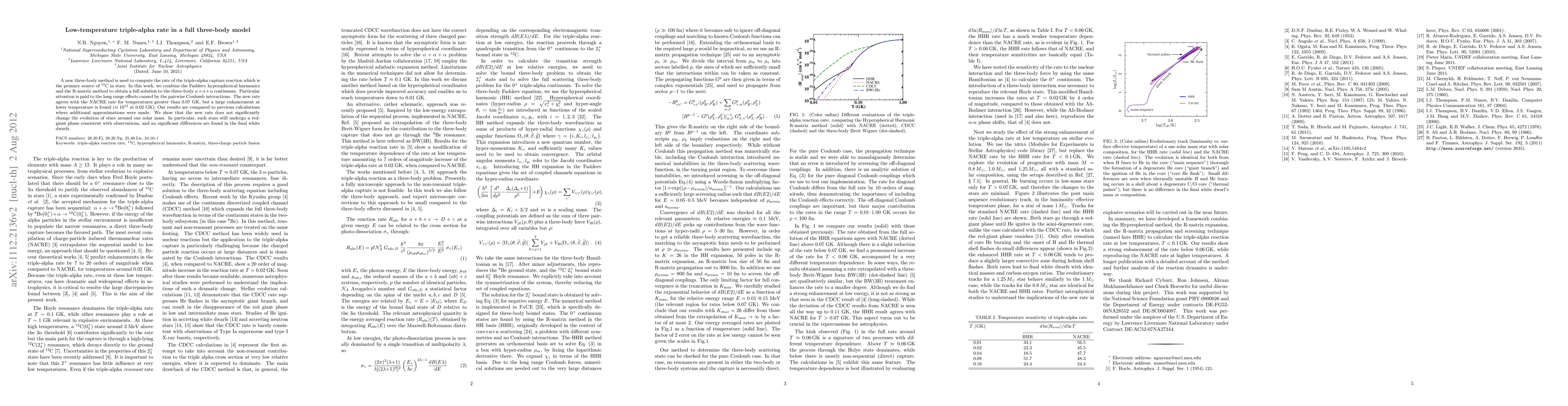 This paper introduces a new full three-body method combining Faddeev hyperspherical harmonics and the R-matrix method to compute the triple-alpha reaction rate, finding a significant enhancement at low temperatures. The new rate maintains consistency with stellar evolution models around one solar mass.
