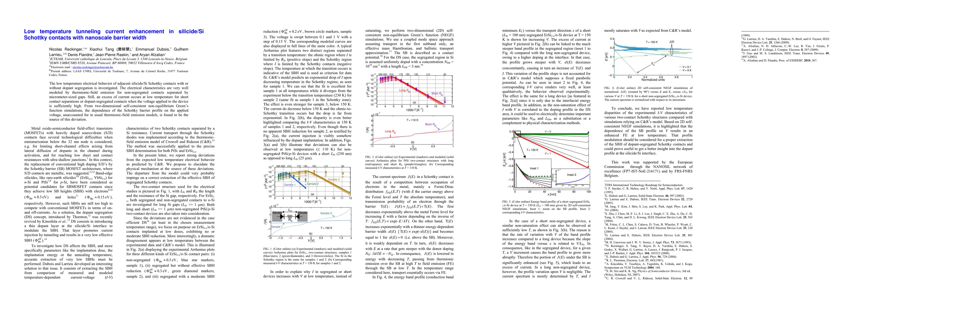 Summary: Research investigates low temperature electrical behavior in silicide/Si Schottky contacts, finding that excess tunneling current arises due to barrier profile changes from applied voltage, deviating from standard thermionic-field emission models. Simulations reveal the impact of nanoscale barrier widths and dopant segregation on current enhancement.