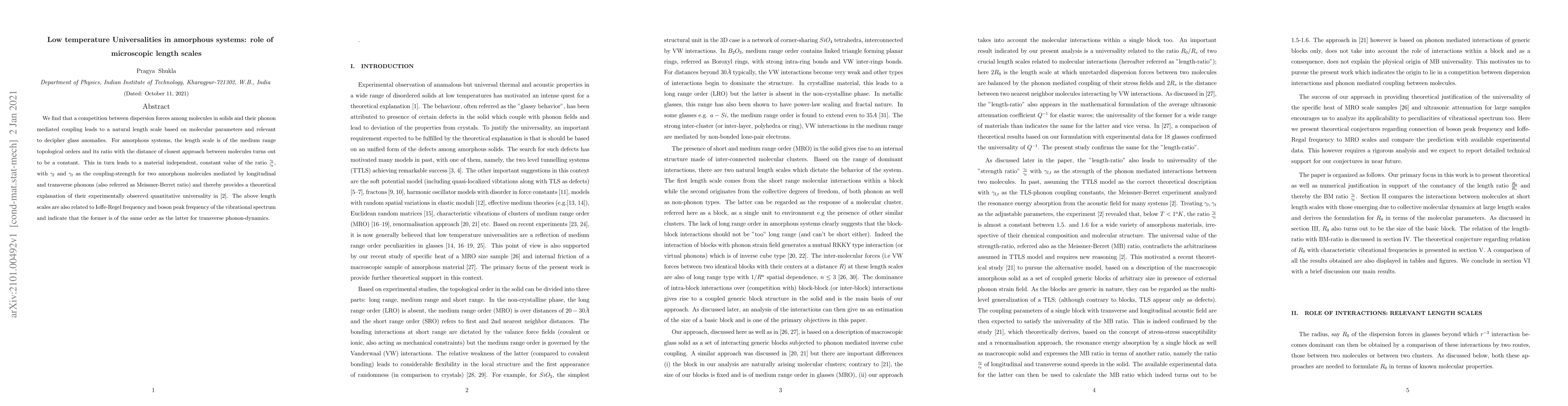 We find that a competition between dispersion forces among molecules in solids and their phonon mediated coupling leads to a natural length scale based on molecular parameters and relevant to decipher glass anomalies. For amorphous systems, the length scale is of the medium range topological orders and its ratio with the distance of closest approach between molecules turns out to be a constant. This in turn leads to a material independent, constant value of the ratio ${\gamma_l \over \gamma_t}$, with $\gamma_l$ and $\gamma_t$ as the coupling-strength for two amorphous molecules mediated by longitudinal and transverse phonons (also referred as Meissner-Berret ratio) and thereby provides a theoretical explanation of their experimentally obserevd quantitative universality in \cite{mb}. The above length scales are also related to Ioffe-Regel frequency and boson peak frequency of the vibrational spectrum and indicate that the former is of the same order as the latter for transverse phonon-dynamics.