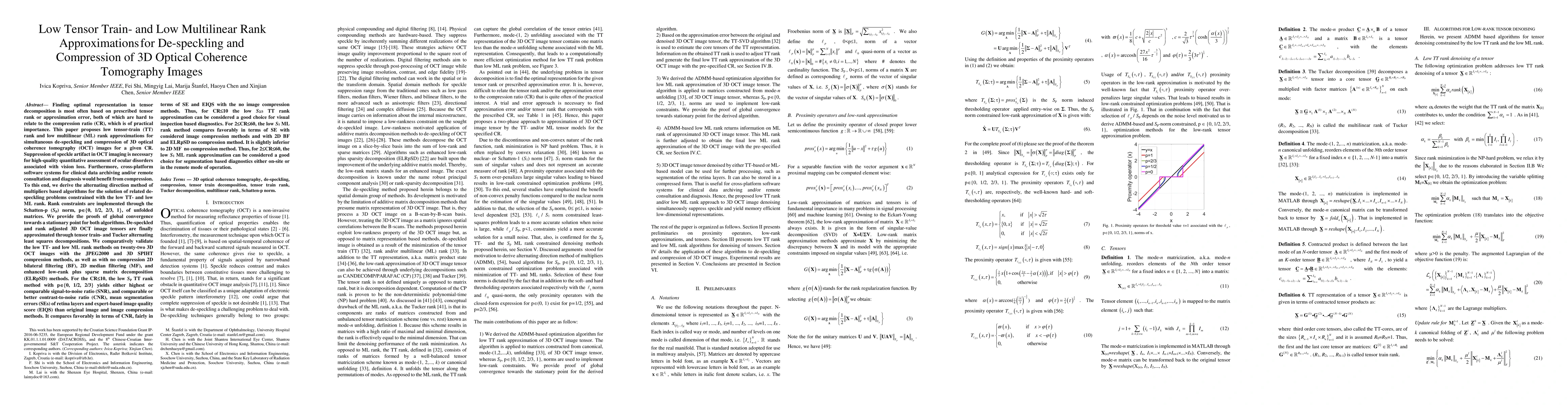 Researchers propose low tensor-train and multilinear rank approximations for de-speckling and compressing 3D OCT images, achieving comparable or better image quality than original images and compression methods in certain compression ratios.