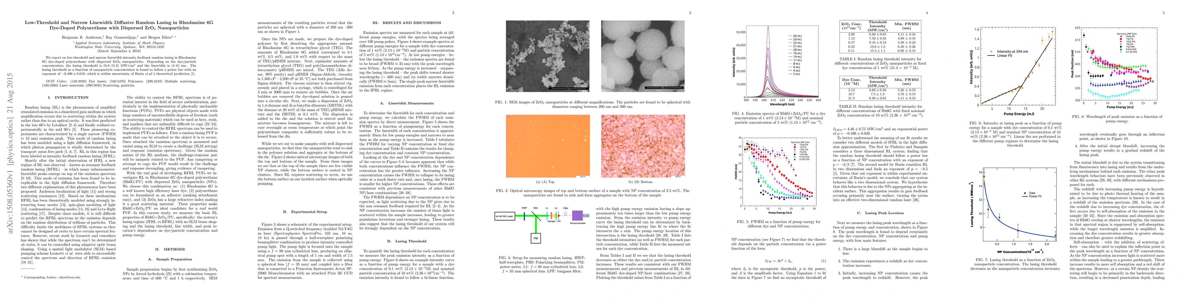 This paper investigates low-threshold and narrow linewidth random lasing in Rhodamine 6G dye-doped polyurethane with dispersed ZrO$_2$ nanoparticles, achieving thresholds between (6.8--15.4) MW/cm$^2$ and linewidths of (4--6) nm. The lasing threshold correlates with nanoparticle concentration following a theoretical prediction.