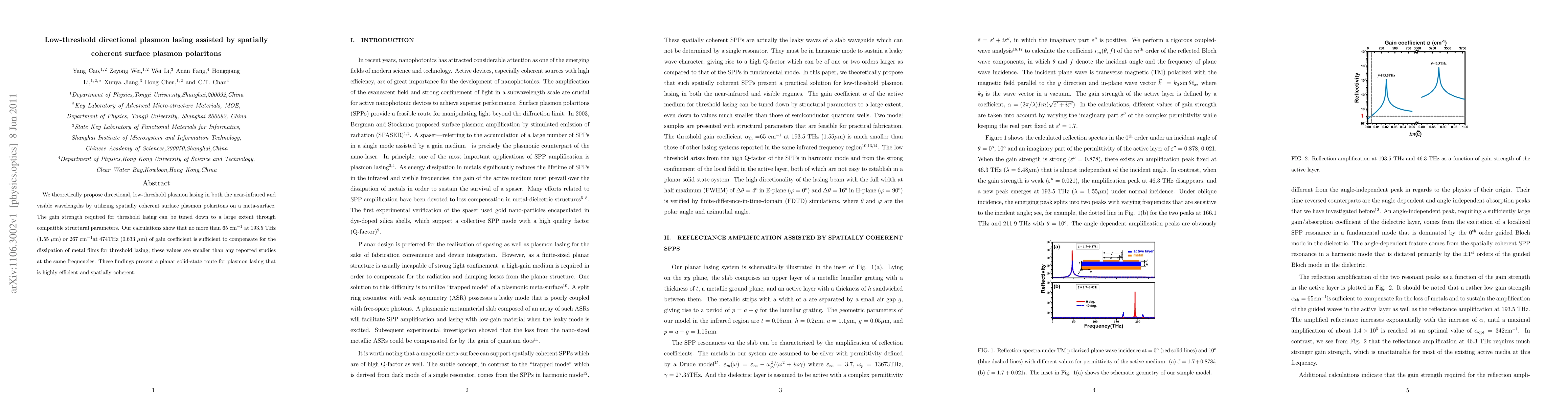 This paper proposes a method for achieving low-threshold, directional plasmon lasing in the near-infrared and visible spectrum using spatially coherent surface plasmon polaritons on a meta-surface. The required gain coefficient is significantly lower than in previous studies, indicating a highly efficient and coherent plasmonic lasing technique.