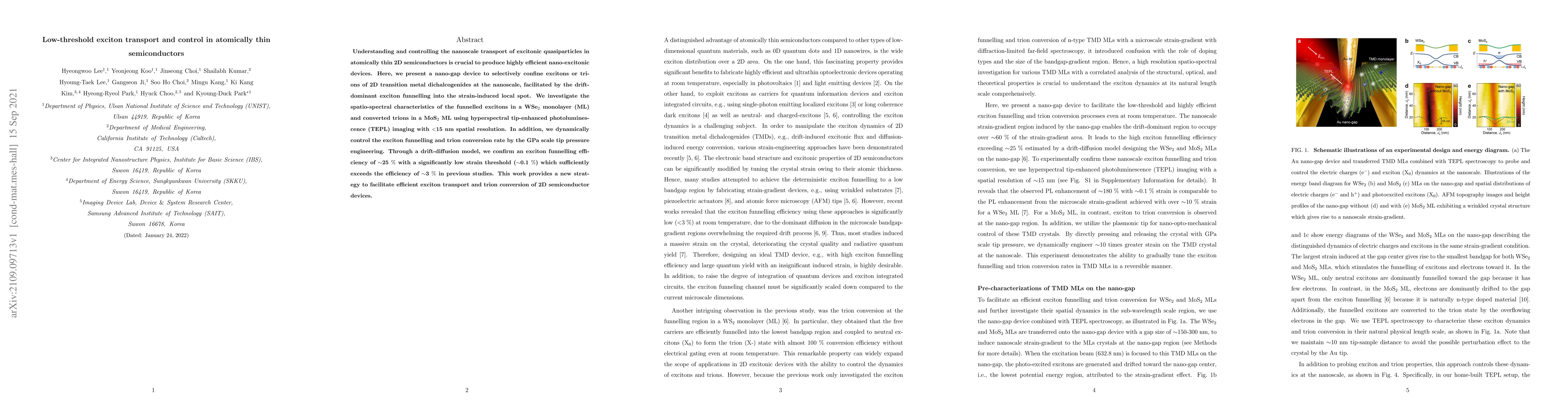 This paper presents a nano-gap device to confine and control excitons in atomically thin 2D semiconductors, achieving an exciton funnelling efficiency of ~25% with low strain (~0.1%), significantly higher than previous studies (~3%). The study uses hyperspectral tip-enhanced photoluminescence imaging to investigate the transport and conversion of excitons and trions in WSe2 and MoS2 monolayers.