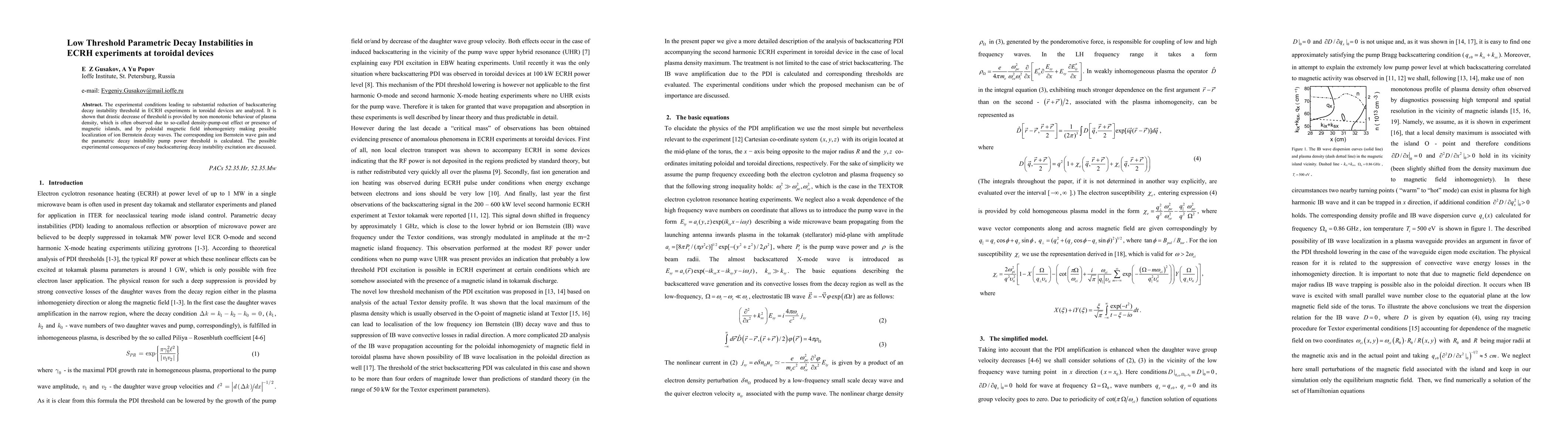 This paper analyzes experimental conditions that significantly reduce the threshold for backscattering decay instability in ECRH experiments within toroidal devices. It finds that a drastic decrease in threshold is due to non-monotonic plasma density behavior and poloidal magnetic field inhomogeneity, which localize ion Bernstein decay waves.