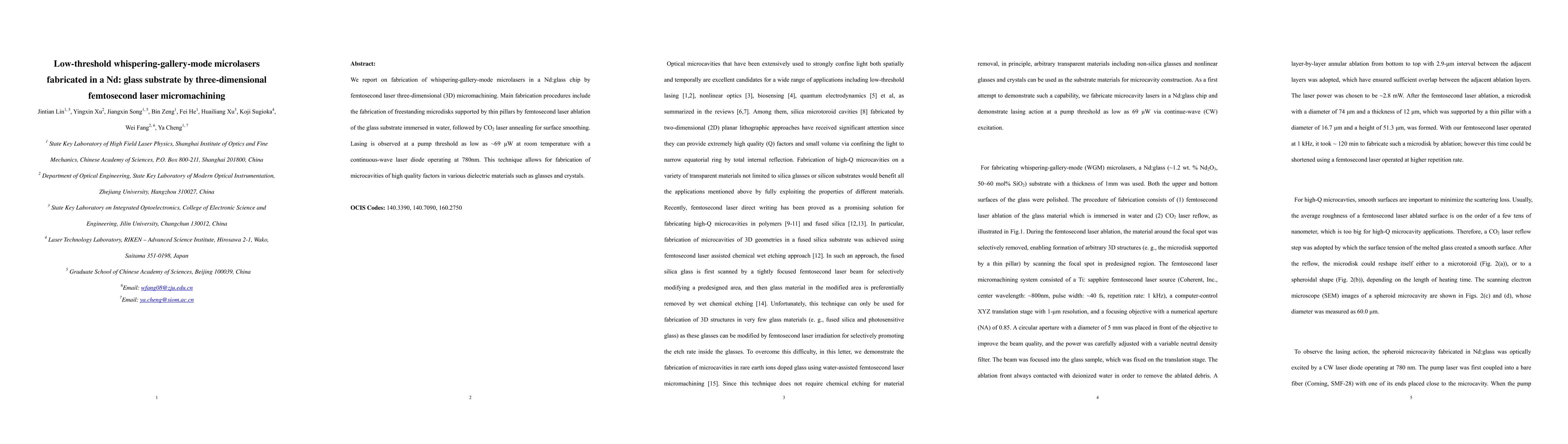 This paper describes the fabrication of low-threshold whispering-gallery-mode microlasers in Nd:glass using femtosecond laser micromachining, achieving lasing at a threshold of ~69 μW with high-quality factors. The process includes microdisk creation via femtosecond laser ablation and CO2 laser annealing for surface smoothing.