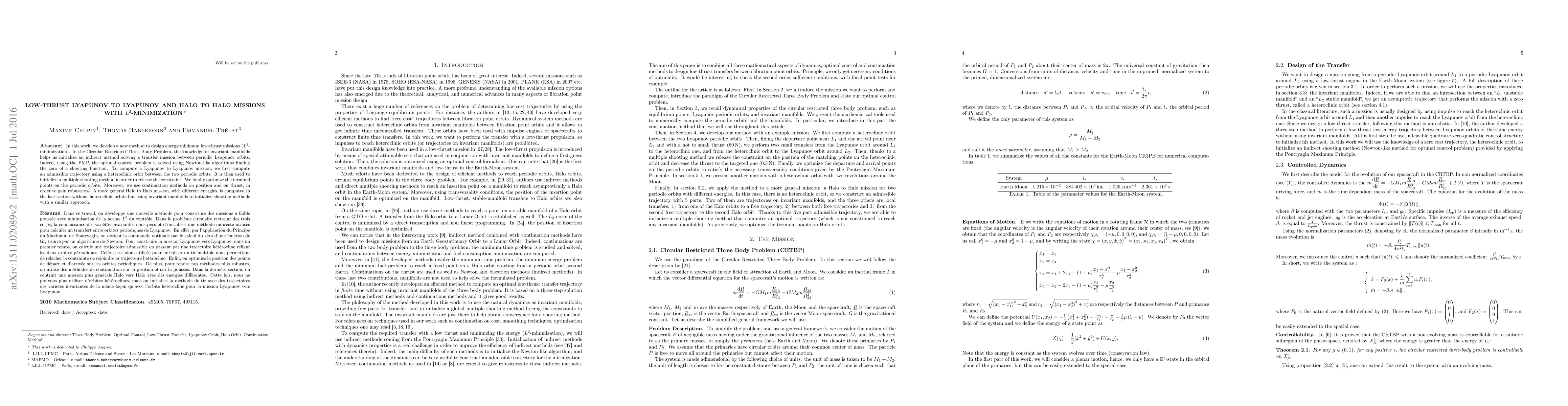 In this work, we develop a new method to design energy minimum low-thrust missions (L2-minimization). In the Circular Restricted Three Body Problem, the knowledge of invariant manifolds helps us initialize an indirect method solving a transfer mission between periodic Lyapunov orbits. Indeed, using the PMP, the optimal control problem is solved using Newton-like algorithms finding the zero of a shooting function. To compute a Lyapunov to Lyapunov mission, we first compute an admissible trajectory using a heteroclinic orbit between the two periodic orbits. It is then used to initialize a multiple shooting method in order to release the constraint. We finally optimize the terminal points on the periodic orbits. Moreover, we use continuation methods on position and on thrust, in order to gain robustness. A more general Halo to Halo mission, with different energies, is computed in the last section without heteroclinic orbits but using invariant manifolds to initialize shooting methods with a similar approach.