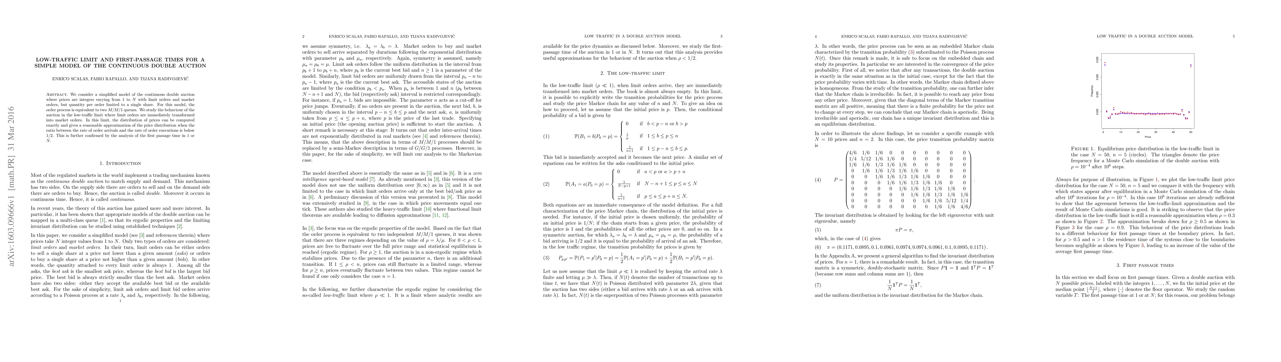 We consider a simplified model of the continuous double auction where prices are integers varying from $1$ to $N$ with limit orders and market orders, but quantity per order limited to a single share. For this model, the order process is equivalent to two $M/M/1$ queues. We study the behaviour of the auction in the low-traffic limit where limit orders are immediately transformed into market orders. In this limit, the distribution of prices can be computed exactly and gives a reasonable approximation of the price distribution when the ratio between the rate of order arrivals and the rate of order executions is below $1/2$. This is further confirmed by the analysis of the first passage time in $1$ or $N$.